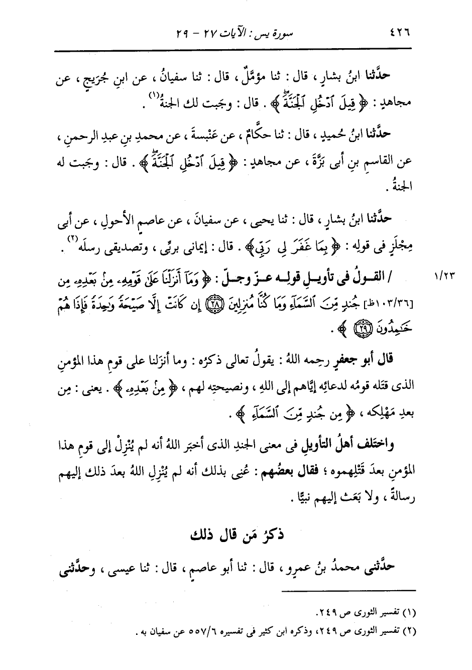 حَدَّثَنَا ابْنُ بَشَّارٍ، قَالَ: ثنا مُؤَمَّلٌ، قَالَ: ثنا سُفْيَانُ، عَنِ ابْنِ جُرَيْجٍ، عَنْ مُجَاهِدٍ {§قِيلَ ادْخُلِ الْجَنَّةَ} [يس: 26] قَالَ: «وَجَبَتْ لَكَ الْجَنَّةُ»