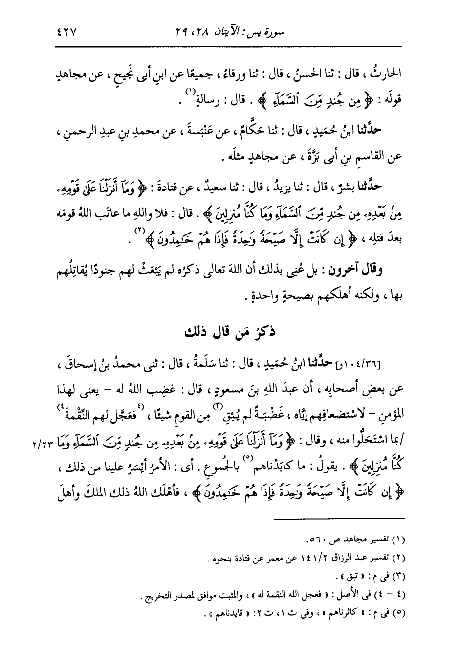 ذِكْرُ مَنْ قَالَ ذَلِكَ: حَدَّثَنَا ابْنُ حُمَيْدٍ، قَالَ: ثنا سَلَمَةُ، قَالَ: ثني ابْنُ إِسْحَاقَ، عَنْ بَعْضِ أَصْحَابِهِ، أَنَّ عَبْدَ اللَّهِ بْنَ مَسْعُودٍ قَالَ: «§غَضِبَ اللَّهُ لَهُ، يَعْنِي لِهَذَا الْمُؤْمِنِ، لِاسْتِضْعَافِهِمْ إِيَّاهُ غَضْبَةً لَمْ تُبْقِ مِنَ الْقَوْمِ شَيْئًا، فَعَجَّلَ لَهُمُ النِّقْمَةَ بِمَا اسْتَحَلُّوا مِنْهُ» وَقَالَ: {وَمَا أَنْزَلْنَا عَلَى قَوْمِهِ مِنْ بَعْدِهِ مِنْ جُنْدٍ مِنَ السَّمَاءِ وَمَا كُنَّا مُنْزَلِينَ} [يس: 28] يَقُولُ: " مَا كَاثَرْنَاهُمْ بِالْجُمُوعِ: أَيِ الْأَمْرُ أَيْسَرُ عَلَيْنَا مِنْ ذَلِكَ " {إِنْ كَانَتْ إِلَّا صَيْحَةً وَاحِدَةً فَإِذَا هُمْ خَامِدُونَ} [يس: 29] " فَأَهْلَكَ اللَّهُ ذَلِكَ الْمَلِكَ وَأَهْلَ