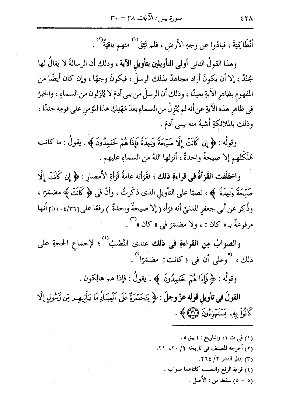 §وَقَوْلُهُ: {إِنْ كَانَتْ إِلَّا صَيْحَةً وَاحِدَةً فَإِذَا هُمْ خَامِدُونَ} [يس: 29] يَقُولُ: مَا كَانَتْ هَلَكَتُهُمْ إِلَّا صَيْحَةً وَاحِدَةً أَنْزَلَهَا اللَّهُ مِنَ السَّمَاءِ عَلَيْهِمْ وَاخْتَلَفَتِ الْقُرَّاءُ فِي قِرَاءَةِ ذَلِكَ، فَقَرَأَتْهُ عَامَّةُ قُرَّاءِ الْأَمْصَارِ {إِنْ كَانَتْ إِلَّا صَيْحَةً وَاحِدَةً} [يس: 29] نَصْبًا عَلَى التَّأْوِيلِ الَّذِي ذَكَرْتُ، وَأَنَّ فِي كَانَتْ مُضْمَرًا وَذُكِرَ عَنْ أَبِي جَعْفَرٍ الْمَدَنِيِّ أَنَّهُ قَرَأَهُ: (إِلَّا صَيْحَةٌ وَاحِدَةً) رَفْعًا عَلَى أَنَّهَا مَرْفُوعَةٌ بِكَانَ، وَلَا مُضْمَرَ فِي كَانَ وَالصَّوَابُ مِنَ الْقِرَاءَةِ فِي ذَلِكَ عِنْدِي النَّصْبُ لِإِجْمَاعِ الْحُجَّةِ عَلَى ذَلِكَ، وَعَلَى أَنَّ فِيَ كَانَتْ مُضْمَرًا