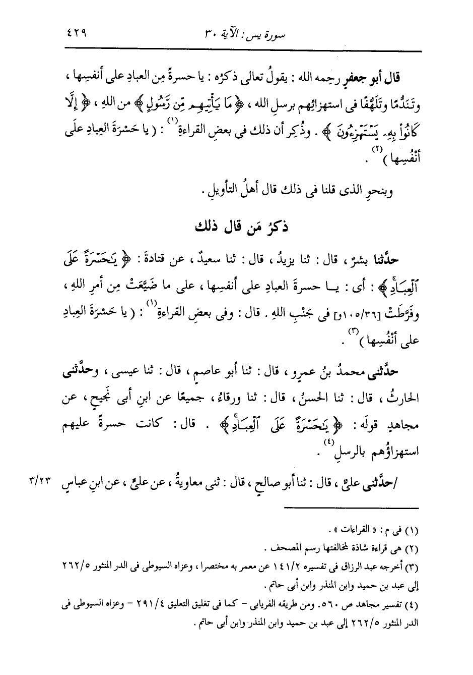 حَدَّثَنِي عَلِيٌّ، قَالَ: ثنا أَبُو صَالِحٍ، قَالَ: ثني مُعَاوِيَةُ، عَنْ عَلِيٍّ، عَنِ ابْنِ عَبَّاسٍ، -[430]- قَوْلُهُ: {§يَا حَسْرَةً عَلَى الْعِبَادِ} [يس: 30] يَقُولُ: «يَا وَيْلًا لِلْعِبَادِ» وَكَانَ بَعْضُ أَهْلِ الْعَرَبِيَّةِ يَقُولُ: مَعْنَى ذَلِكَ: يَا لَهَا حَسْرَةً عَلَى الْعِبَادِ
