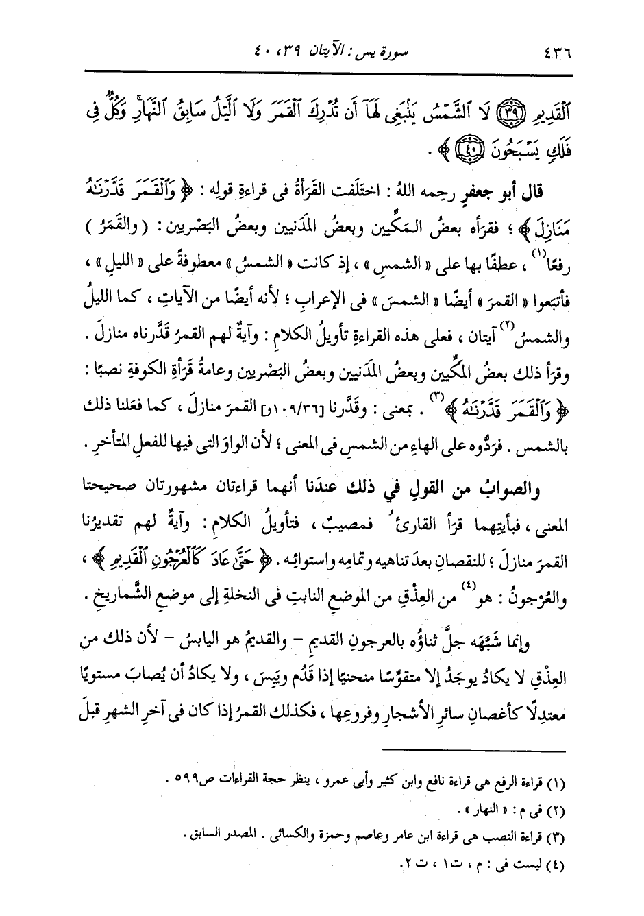 الْقَدِيمِ لَا الشَّمْسُ يَنبَغِي لَهَا أَنْ تُدْرِكَ الْقَمَرَ وَلَا اللَّيْلُ سَابِقُ النَّهَارِ وَكُلٌّ فِي فَلَكٍ يَسْبَحُونَ} [يس: 40] اخْتَلَفَتِ الْقُرَّاءُ فِي قِرَاءَةِ قَوْلِهِ: {وَالْقَمَرَ قَدَّرْنَاهُ مَنَازِلَ} [يس: 39] فَقَرَأَهُ بَعْضُ الْمَكِّيِّينَ وَبَعْضُ الْمَدَنِيِّينَ وَبَعْضُ الْبَصْرِيِّينَ: (وَالْقَمَرُ) رَفْعًا عَطْفًا بِهَا عَلَى الشَّمْسِ، إِذْ كَانَتِ الشَّمْسُ مَعْطُوفَةً عَلَى اللَّيْلِ، فَأَتْبَعُوا الْقَمَرَ أَيْضًا الشَّمْسَ فِي الْإِعْرَابِ، لِأَنَّهُ أَيْضًا مِنَ الْآيَاتِ، كَمَا اللَّيْلُ وَالنَّهَارُ آيَتَانِ، فَعَلَى هَذِهِ الْقِرَاءَةِ تَأْوِيلُ الْكَلَامِ: وَآيَةٌ لَهُمُ الْقَمَرُ قَدَّرْنَاهُ مَنَازِلَ وَقَرَأَ ذَلِكَ بَعْضُ الْمَكِّيِّينَ وَبَعْضُ الْمَدَنِيِّينَ وَبَعْضُ الْبَصْرِيِّينَ، وَعَامَّةُ قُرَّاءِ الْكُوفَةِ نَصْبًا: {وَالْقَمَرَ قَدَّرْنَاهُ} [يس: 39] بِمَعْنَى: وَقَدَّرْنَا الْقَمَرَ مَنَازِلَ، كَمَا فَعَلْنَا ذَلِكَ بِالشَّمْسِ، فَرَدُّوهُ عَلَى الْهَاءِ مِنَ الشَّمْسِ فِي الْمَعْنَى، لِأَنَّ الْوَاوَ الَّتِي فِيهَا لِلْفِعْلِ الْمُتَأَخِّرِ وَالصَّوَابُ مِنَ الْقَوْلِ فِي ذَلِكَ عِنْدَنَا أَنَّهُمَا قِرَاءَتَانِ مَشْهُورَتَانِ صَحِيحَتَا الْمَعْنَى، فَبِأَيَّتِهِمَا قَرَأَ الْقَارِئُ فَمُصِيبٌ فَتَأْوِيلُ الْكَلَامِ: وَآيَةٌ لَهُمْ تَقْدِيرُنَا الْقَمَرَ مَنَازِلَ لِلنُّقْصَانِ بَعْدَ تَنَاهِيهِ وَتَمَامِهِ وَاسْتِوَائِهِ، حَتَّى عَادَ كَالْعُرْجُونِ الْقَدِيمِ؛ وَالْعُرْجُونُ: مِنَ الْعِذْقِ مِنَ الْمَوْضِعِ النَّابِتِ فِي النَّخْلَةِ إِلَى مَوْضِعِ الْشَمَارِيخِ؛ وَإِنَّمَا شَبَّهَهُ جَلَّ ثَنَاؤُهُ بِالْعُرْجُونِ الْقَدِيمِ وَالْقَدِيمُ هُوَ الْيَابِسُ لِأَنَّ ذَلِكَ مِنَ الْعِذْقِ، لَا يَكَادُ يُوجَدُ إِلَّا مُتَقَوِّسًا مُنْحَنِيًا إِذَا قَدِمَ وَيَبِسَ، وَلَا يَكَادُ أَنْ يُصَابَ مُسْتَوِيًا مُعْتَدِلًا، كَأَغْصَانِ سَائِرِ الْأَشْجَارِ وَفُرُوعِهَا، فَكَذَلِكَ الْقَمَرُ إِذَا كَانَ فِي آخِرِ الشَّهْرِ قَبْلَ
