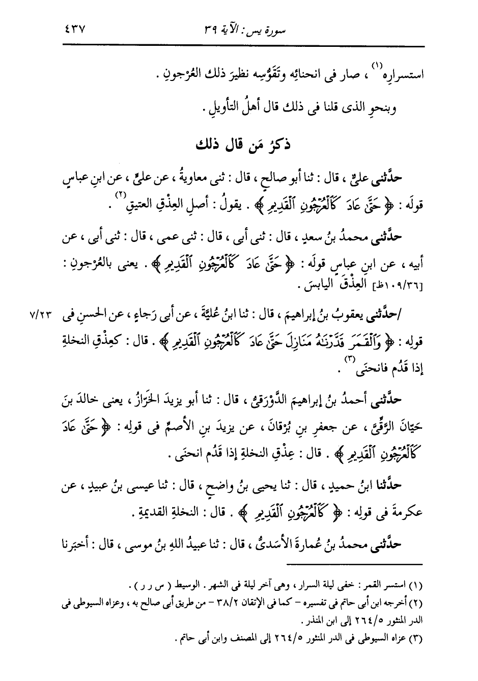 اسْتِسْرَارِهِ، صَارَ فِي انْحِنَائِهِ وَتَقَوُّسِهِ نَظِيرَ ذَلِكَ الْعُرْجُونِ وَبِنَحْوِ الَّذِي قُلْنَا فِي ذَلِكَ قَالَ أَهْلُ التَّأْوِيلِ