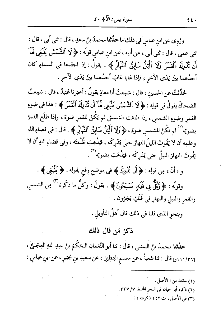 ذِكْرُ مَنْ قَالَ ذَلِكَ: حَدَّثَنَا مُحَمَّدُ بْنُ الْمُثَنَّى، قَالَ: ثنا أَبُو النُّعْمَانِ الْحَكَمُ بْنُ عَبْدِ اللَّهِ الْعِجْلِيُّ، قَالَ: ثنا شُعْبَةُ، عَنْ مُسْلِمٍ الْبَطِينِ، عَنْ سَعِيدِ بْنِ جُبَيْرٍ، عَنِ ابْنِ عَبَّاسٍ {§-[441]- وَكُلٌّ فِي فَلَكٍ يَسْبَحُونَ} [يس: 40] قَالَ: «فِي فَلَكٍ كَفَلَكِ الْمِغْزَلِ» حَدَّثَنَا ابْنُ الْمُثَنَّى، قَالَ: ثنا عَبْدُ الصَّمَدِ، قَالَ: ثنا شُعْبَةُ، قَالَ: ثنا الْأَعْمَشُ، عَنْ مُسْلِمٍ الْبَطِينِ، عَنْ سَعِيدِ بْنِ جُبَيْرٍ، عَنِ ابْنِ عَبَّاسٍ مِثْلُهُ