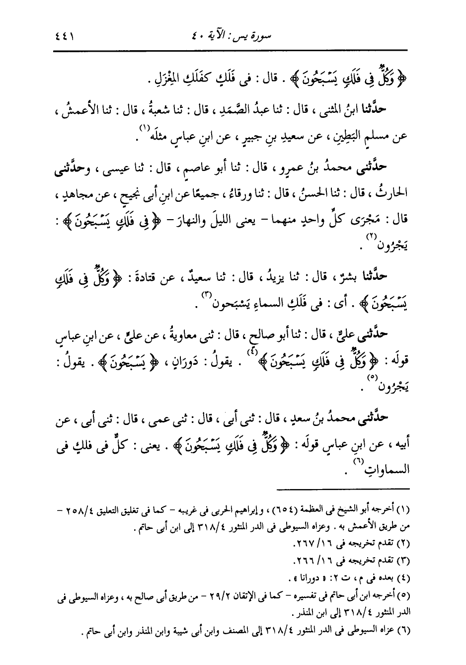 حَدَّثَنِي عَلِيٌّ، قَالَ: ثنا أَبُو صَالِحٍ، قَالَ: ثني مُعَاوِيَةُ، عَنْ عَلِيٍّ، عَنِ ابْنِ عَبَّاسٍ، قَوْلُهُ: {§وَكُلٌّ فِي فَلَكٍ يَسْبَحُونَ} [يس: 40] " دَوَرَانًا، يَقُولُ: دَوَرَانًا يَسْبَحُونَ؛ يَقُولُ: يَجْرُونَ "