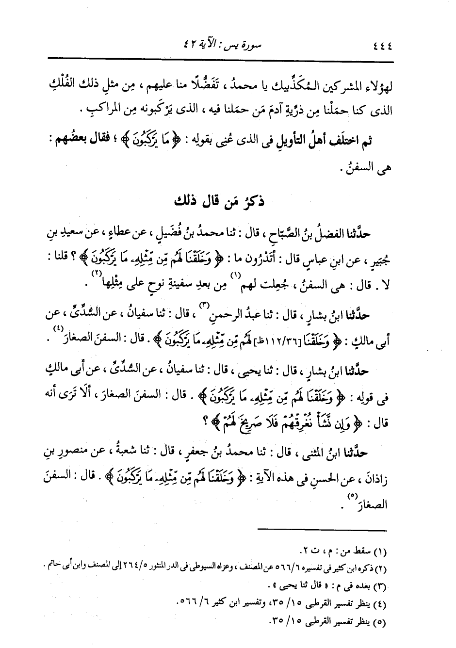 قَالَ: ثنا ابْنُ بَشَّارٍ، قَالَ: ثنا يَحْيَى، قَالَ: ثنا سُفْيَانُ، عَنِ السُّدِّيِّ، عَنْ أَبِي مَالِكٍ، فِي قَوْلِهِ: {وَخَلَقْنَا لَهُمْ مِنْ مِثْلِهِ مَا يَرْكَبُونَ} [يس: 42] قَالَ: «§السُّفُنُ الصِّغَارُ، أَلَا تَرَى أَنَّهُ قَالَ» : {وَإِنْ نَشَأْ نُغْرِقْهُمْ فَلَا صَرِيخَ لَهُمْ} [يس: 43]