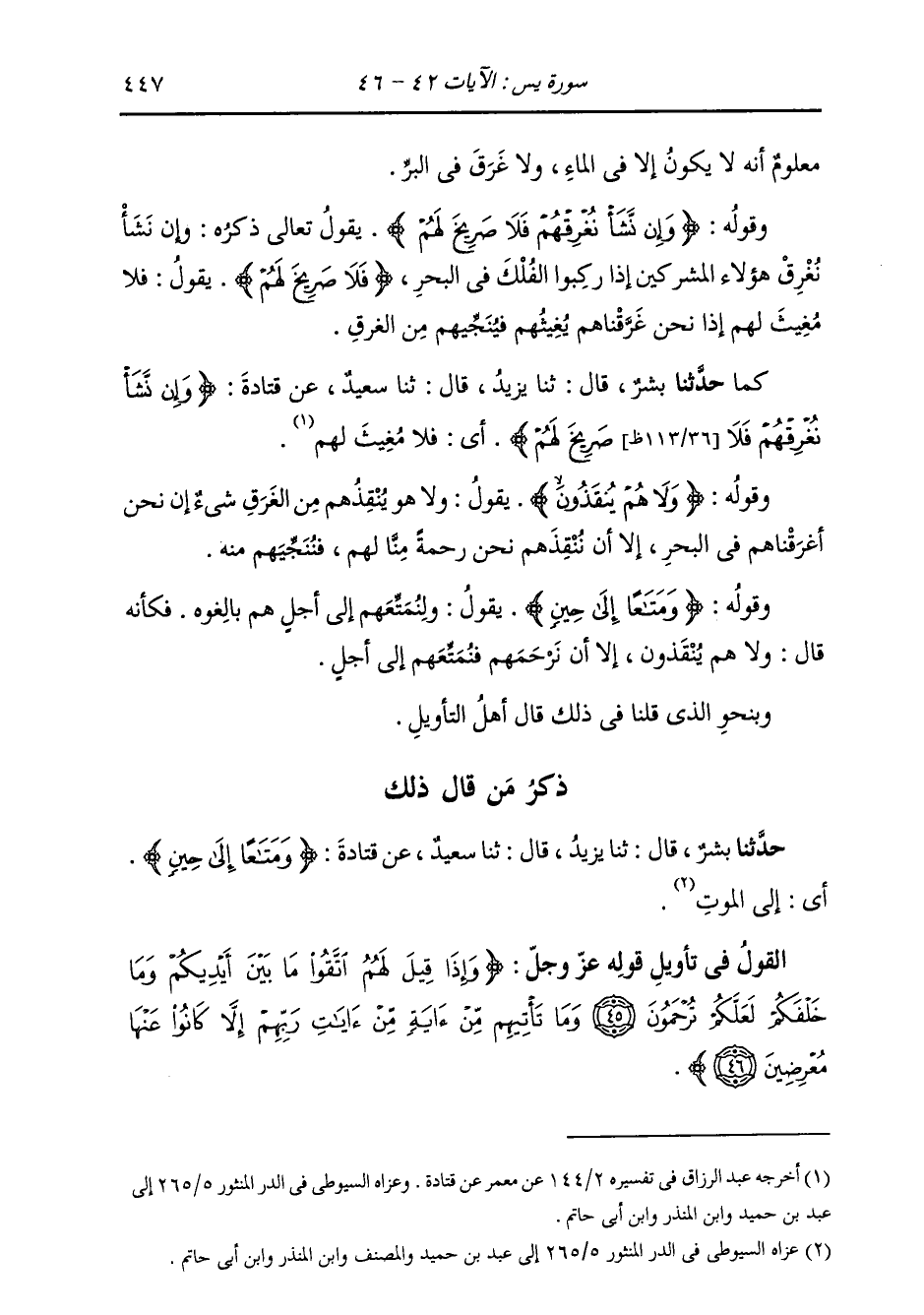 كَمَا: حَدَّثَنَا بِشْرٌ، قَالَ: ثنا يَزِيدُ، قَالَ: ثنا سَعِيدٌ، عَنْ قَتَادَةَ {§وَإِنْ نَشَأْ نُغْرِقْهُمْ فَلَا صَرِيخَ لَهُمْ} [يس: 43] «أَيْ لَا مُغِيثَ»