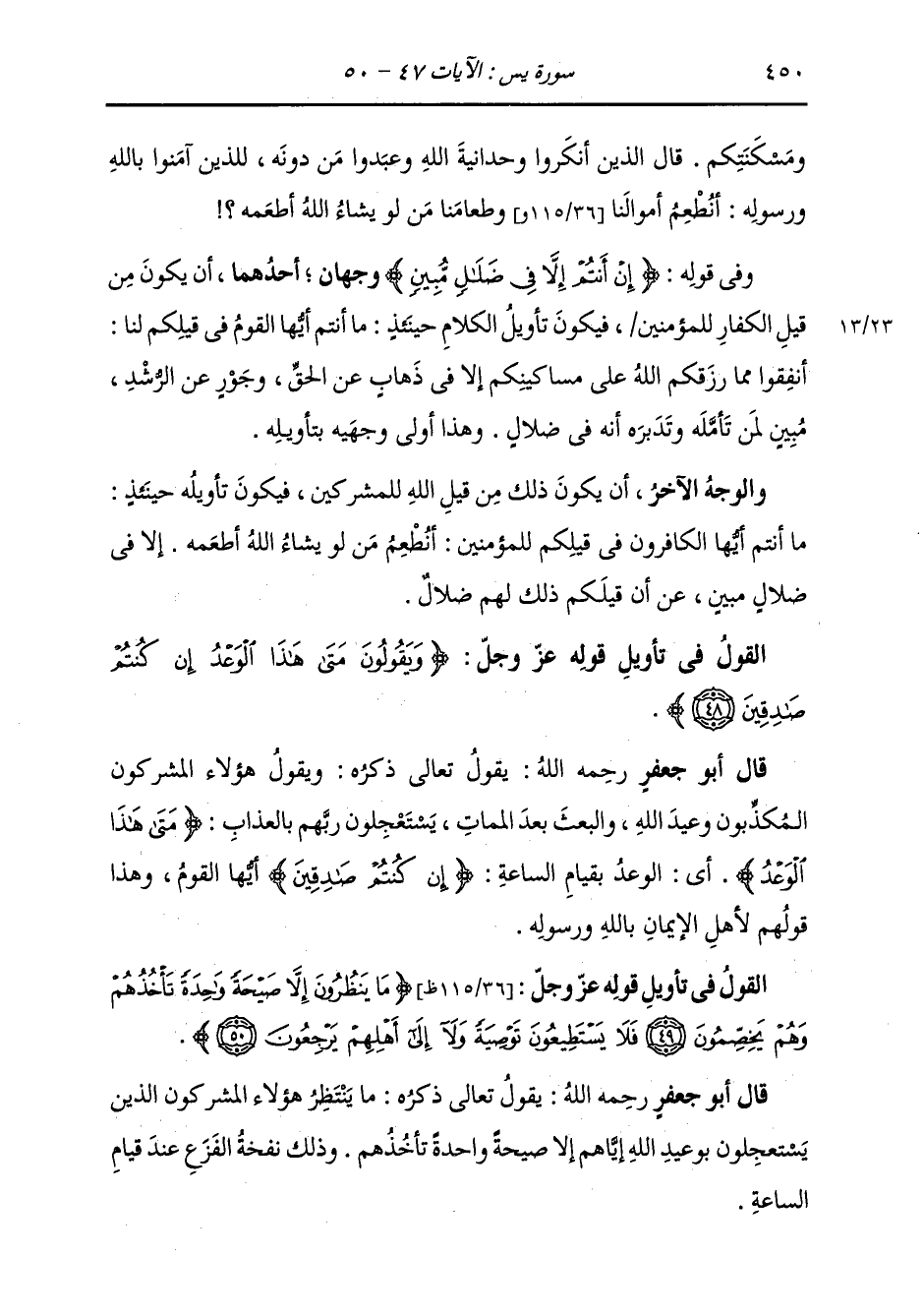 وَمَسْكَنَتِكُمْ، قَالَ الَّذِينَ أَنْكَرُوا وَحْدَانِيَّةَ اللَّهِ وَعَبَدُوا مِنْ دُونِهِ لِلَّذِينَ آمَنُوا بِاللَّهِ وَرَسُولِهِ: أَنُطْعِمُ أَمْوَالَنَا وَطَعَامَنَا مَنْ لَوِ يَشَاءُ اللَّهُ أَطْعَمَهُ؟ وَفِي قَوْلِهِ: {إِنْ أَنْتُمْ إِلَّا فِي ضَلَالٍ مُبِينٍ} [يس: 47] وَجْهَانِ: أَحَدُهُمَا أَنْ يَكُونَ مِنْ قِيلِ الْكُفَّارِ لِلْمُؤْمِنِينَ، فَيَكُونُ تَأْوِيلُ الْكَلَامِ حِينَئِذٍ: مَا أَنْتُمْ أَيُّهَا الْقَوْمُ فِي قِيلِكُمْ لَنَا: أَنْفِقُوا مِمَّا رَزَقَكُمُ اللَّهُ عَلَى مَسَاكِينِكُمْ، إِلَّا فِي ذَهَابٍ عَنِ الْحَقِّ، وَجَوْرٍ عَنِ الرُّشْدِ مُبِينٍ لِمَنْ تَأَمَّلَهُ وَتَدَبَّرَهُ، أَنَّهُ فِي ضَلَالٍ؛ وَهَذَا أَوْلَى وَجْهَيْهِ بِتَأْوِيلِهِ. وَالْوَجْهُ الْآخَرُ: أَنْ يَكُونَ ذَلِكَ مِنْ قِيلِ اللَّهِ لِلْمُشْرِكِينَ، فَيَكُونُ تَأْوِيلُهُ حِينَئِذٍ: مَا أَنْتُمْ أَيُّهَا الْكَافِرُونَ فِي قِيلِكُمْ لِلْمُؤْمِنِينَ: أَنُطْعِمُ مَنْ لَوِ يَشَاءُ اللَّهُ أَطْعَمَهُ، إِلَّا فِي ضَلَالٍ مُبِينٍ، عَنْ أَنَّ قِيلَكُمْ ذَلِكَ لَهُمْ ضَلَالٌ