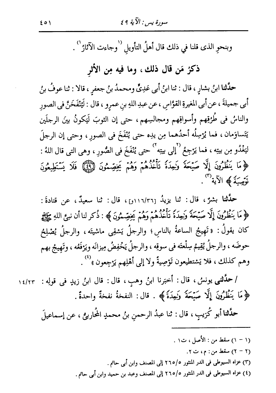 ذِكْرُ مَنْ قَالَ ذَلِكَ، وَمَا فِيهِ مِنَ الْأَثَرِ: حَدَّثَنَا ابْنُ بَشَّارٍ، قَالَ: ثنا ابْنُ أَبِي عَدِيٍّ، وَمُحَمَّدُ بْنُ جَعْفَرٍ، قَالَا: ثنا عَوْفُ بْنُ أَبِي جَمِيلَةَ، عَنْ أَبِي الْمُغِيرَةِ الْقَوَّاسِ، عَنْ عَبْدِ اللَّهِ بْنِ عَمْرٍو، قَالَ: " §لَيَنْفُخَنَّ فِي الصُّورِ، وَالنَّاسُ فِي طُرُقِهِمْ وَأَسْوَاقِهِمْ وَمَجَالِسِهِمْ، حَتَّى إِنَّ الثَّوْبَ لَيَكُونَ بَيْنَ الرَّجُلَيْنِ يَتَسَاوَمَانِ، فَمَا يُرْسِلُهُ أَحَدُهُمَا مِنْ يَدِهِ حَتَّى يُنْفَخَ فِي الصُّورِ، وَحَتَّى إِنَّ الرَّجُلَ لَيَغْدُو مِنْ بَيْتِهِ فَلَا يَرْجِعُ حَتَّى يَنْفُخَ فِي الصُّورِ، وَهِيَ الَّتِي قَالَ اللَّهُ: {مَا يَنْظُرُونَ إِلَّا صَيْحَةً وَاحِدَةً تَأْخُذُهُمْ وَهُمْ يَخِصِّمُونَ فَلَا يَسْتَطِيعُونَ تَوْصِيَةً} [يس: 50] . . الْآيَةَ "