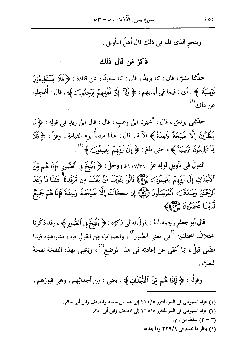 §الْقَوْلُ فِي تَأْوِيلِ قَوْلِهِ تَعَالَى: {وَنُفِخَ فِي الصُّورِ فَإِذَا هُمْ مِنَ الْأَجْدَاثِ إِلَى رَبِّهِمْ يَنْسِلُونَ قَالُوا يَا وَيْلَنَا مَنْ بَعَثَنَا مِنْ مَرْقَدِنَا هَذَا مَا وَعَدَ الرَّحْمَنُ وَصَدَقَ الْمُرْسَلُونَ إِنْ كَانَتْ إِلَّا صَيْحَةً وَاحِدَةً فَإِذَا هُمْ جَمِيعٌ لَدَيْنَا مُحْضَرُونَ} [يس: 52] يَقُولُ تَعَالَى ذِكْرُهُ: {وَنُفِخَ فِي الصُّورِ} [الكهف: 99] وَقَدْ ذَكَرْنَا اخْتِلَافَ الْمُخْتَلِفِينَ وَالصَّوَابُ مِنَ الْقَوْلِ فِيهِ بِشَوَاهِدِهِ فِيمَا مَضَى قَبْلُ بِمَا أَغْنَى عَنْ إِعَادَتِهِ فِي هَذَا الْمَوْضِعِ، وَيَعْنِي بِهَذِهِ النَّفْخَةِ، نَفْخَةَ الْبَعْثِ