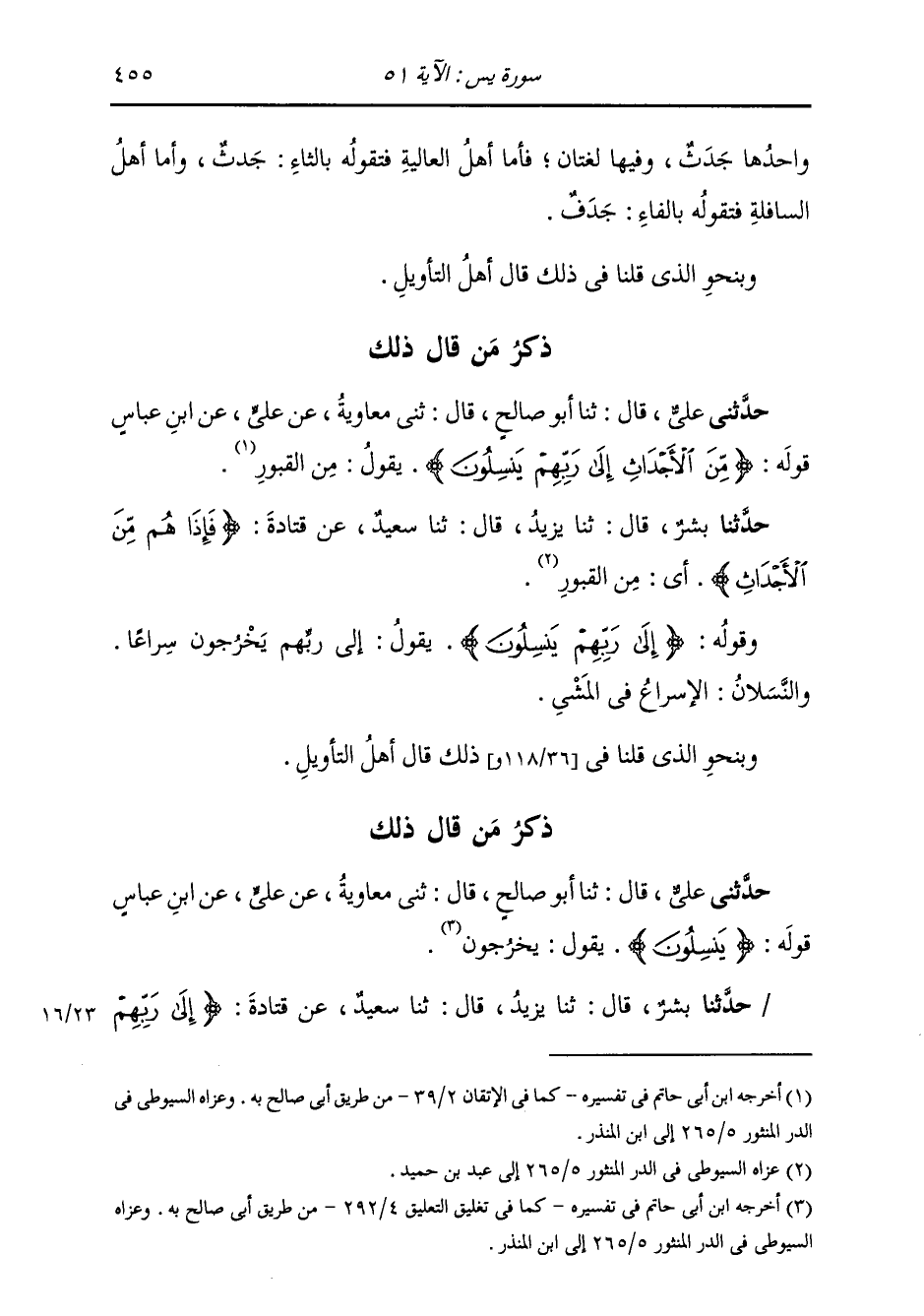 ذِكْرُ مَنْ قَالَ ذَلِكَ: حَدَّثَنِي عَلِيٌّ، قَالَ: ثنا أَبُو صَالِحٍ، قَالَ: ثني مُعَاوِيَةُ، عَنْ عَلِيٍّ، عَنِ ابْنِ عَبَّاسٍ، قَوْلُهُ: {§مِنَ الْأَجْدَاثِ إِلَى رَبِّهِمْ يَنْسِلُونَ} [يس: 51] يَقُولُ: «مِنَ الْقُبُورِ»