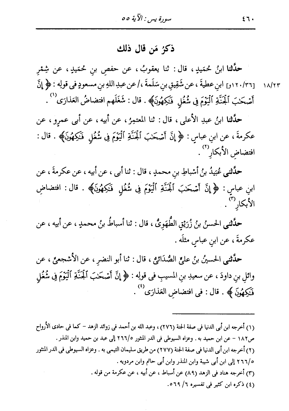 حَدَّثَنِي عُبَيْدُ بْنُ أَسْبَاطِ بْنِ مُحَمَّدٍ، قَالَ: ثنا أَبِي، عَنْ أَبِيهِ، عَنْ عِكْرِمَةَ، عَنِ ابْنِ عَبَّاسٍ {§إِنَّ أَصْحَابَ الْجَنَّةِ الْيَوْمَ فِي شُغُلٍ فَاكِهُونَ} [يس: 55] قَالَ: «افْتِضَاضُ الْأَبْكَارِ» حَدَّثَنِي الْحَسَنُ بْنُ زُرَيْقِ الطُّهَوِيُّ، قَالَ: ثنا أَسْبَاطُ بْنُ مُحَمَّدٍ، عَنْ أَبِيهِ، عَنْ عِكْرِمَةَ، عَنِ ابْنِ عَبَّاسٍ مِثْلُهُ