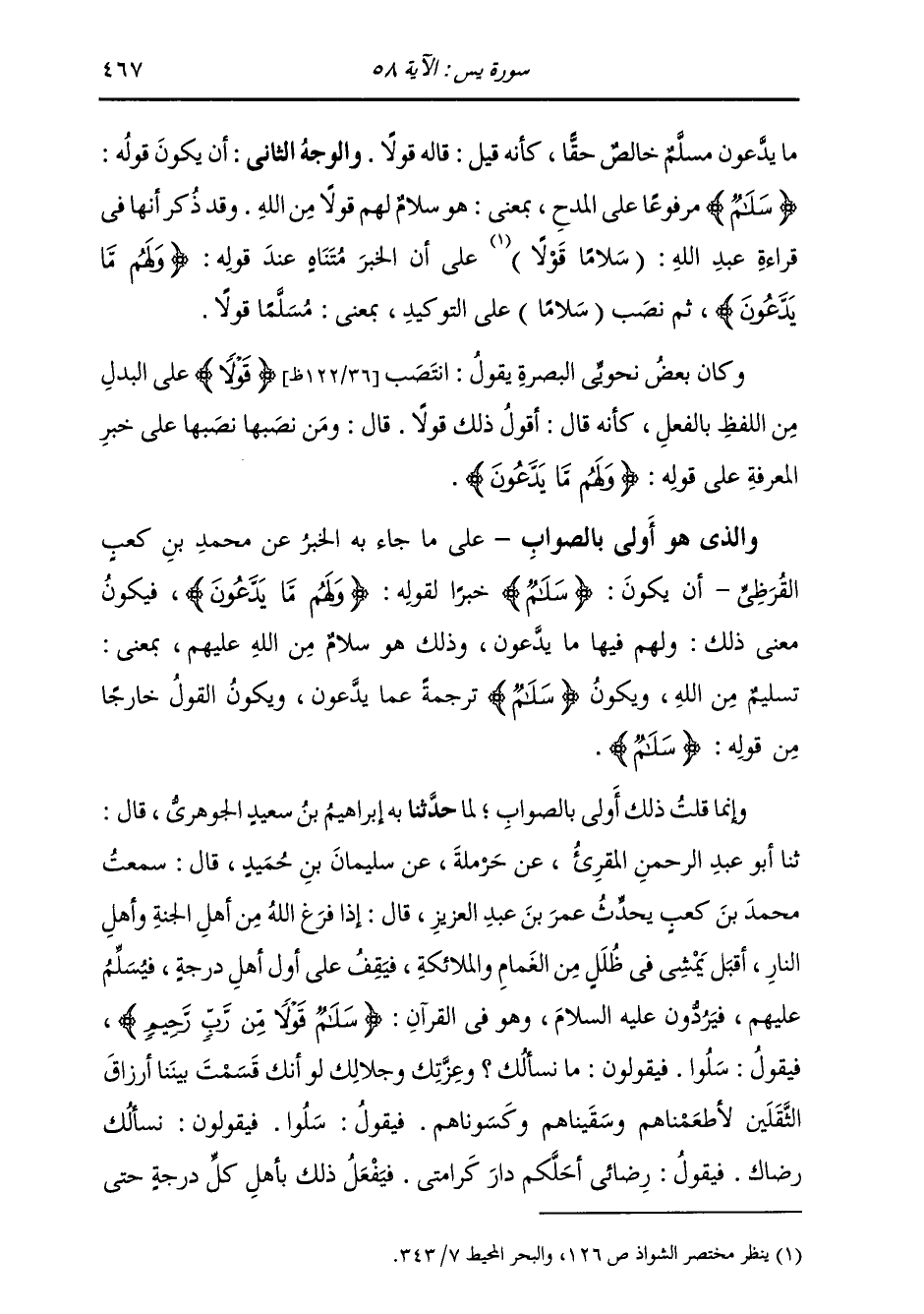 وَإِنَّمَا قُلْتُ ذَلِكَ أَوْلَى بِالصَّوَابِ لِمَا: حَدَّثَنَا بِهِ، إِبْرَاهِيمُ بْنُ سَعِيدٍ الْجَوْهَرِيُّ، قَالَ: ثنا أَبُو عَبْدِ الرَّحْمَنِ الْمُقْرِئُ، عَنْ حَرْمَلَةَ، عَنْ سُلَيْمَانَ بْنِ حُمَيْدٍ، قَالَ: سَمِعْتُ مُحَمَّدَ بْنَ كَعْبٍ، يُحَدِّثُ عُمَرَ بْنَ عَبْدِ الْعَزِيزِ قَالَ: " §إِذَا فَرَغَ اللَّهُ مِنْ أَهْلِ الْجَنَّةِ وَأَهْلِ النَّارِ، أَقْبَلَ يَمْشِي فِي ظُلَلٍ مِنَ الْغَمَامِ وَالْمَلَائِكَةِ، فَيَقِفُ عَلَى أَوَّلِ أَهْلٍ دَرَجَةً، فَيُسَلِّمُ عَلَيْهِمْ، فَيَرُدُّونَ عَلَيْهِ السَّلَامَ، وَهُوَ فِي الْقُرْآنِ: {سَلَّامٌ قَوْلًا مِنْ رَبٍّ رَحِيمٍ} [يس: 58] فَيَقُولُ: سَلُوا، فَيَقُولُونَ: مَا نَسْأَلُكَ وَعِزَّتِكَ وَجَلَالِكَ، لَوْ أَنَّكَ قَسَمْتَ بَيْنَنَا أَرْزَاقَ الثَّقَلَيْنِ لَأَطْعَمْنَاهُمْ وَسَقَيْنَاهُمْ وَكَسَوْنَاهُمْ، فَيَقُولُ: سَلُوا، فَيَقُولُونَ: نَسْأَلُكَ رِضَاكَ، فَيَقُولُ: رِضَائِي أَحَلَّكُمْ دَارَ كَرَامَتِي، فَيَفْعَلُ ذَلِكَ بِأَهْلِ كُلِّ دَرَجَةٍ حَتَّى
