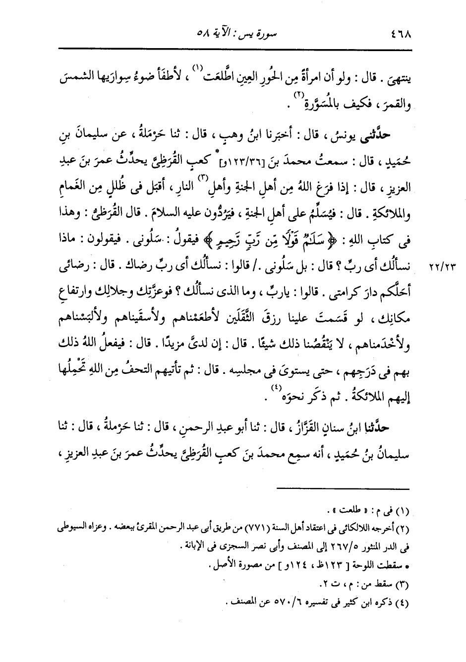 يَنْتَهِيَ، قَالَ: وَلَوْ أَنَّ امْرَأَةً مِنَ الْحُورِ الْعَيْنِ طَلَعَتْ لَأَطْفَأَ ضَوْءُ سِوَارَيْهَا الشَّمْسَ وَالْقَمَرَ، فَكَيْفَ بِالْمُسَوَّرَةِ " حَدَّثَنِي يُونُسُ، قَالَ: أَخْبَرَنَا ابْنُ وَهْبٍ، قَالَ: ثنا حَرْمَلَةُ، عَنْ سُلَيْمَانَ بْنِ حُمَيْدٍ، قَالَ: سَمِعْتُ مُحَمَّدَ بْنَ كَعْبٍ الْقُرَظِيَّ يُحَدِّثُ عُمَرَ بْنَ عَبْدِ الْعَزِيزِ، قَالَ: إِذَا فَرَغَ اللَّهُ مِنْ أَهْلِ الْجَنَّةِ وَالنَّارِ، أَقْبَلَ فِي ظُلَلٍ مِنَ الْغَمَامِ وَالْمَلَائِكَةِ، قَالَ: فَيُسَلِّمُ عَلَى أَهْلِ الْجَنَّةِ، فَيَرُدُّونَ عَلَيْهِ السَّلَامَ، قَالَ الْقُرَظِيُّ: وَهَذَا فِي كِتَابِ اللَّهِ: {سَلَّامٌ قَوْلًا مِنْ رَبٍّ رَحِيمٍ} [يس: 58] فَيَقُولُ: سَلُونِي، فَيَقُولُونَ: مَاذَا نَسْأَلُكَ، أَيْ رَبِّ؟ قَالَ: بَلْ سَلُونِي، قَالُوا: نَسْأَلُكَ أَيْ رَبِّ رِضَاكَ، قَالَ: رِضَائِي أَحَلَّكُمْ دَارَ كَرَامَتِي، قَالُوا: يَا رَبِّ وَمَا الَّذِي نَسْأَلُكَ فَوَعِزَّتِكَ وَجَلَالِكَ وَارْتِفَاعِ مَكَانِكَ، لَوْ قَسَمْتَ عَلَيْنَا رِزْقَ الثَّقَلَيْنِ لَأَطْعَمْنَاهُمْ، وَلَأَسْقَيْنَاهُمْ، وَلَأَلْبَسْنَاهُمْ وَلَأَخْدَمْنَاهُمْ، لَا يُنْقِصْنَا ذَلِكَ شَيْئًا، قَالَ: إِنَّ لَدَيَّ مَزِيدًا، قَالَ: فَيَفْعَلُ اللَّهُ ذَلِكَ بِهِمْ فِي دَرَجِهِمْ حَتَّى يَسْتَوِيَ فِي مَجْلِسِهِ، قَالَ: ثُمَّ تَأْتِيهِمُ التُّحَفُ مِنَ اللَّهِ تَحْمِلُهَا إِلَيْهِمُ الْمَلَائِكَةُ. ثُمَّ ذَكَرَ نَحْوَهُ. حَدَّثَنَا ابْنُ سِنَانٍ الْقَزَّازُ، قَالَ: ثنا أَبُو عَبْدِ الرَّحْمَنِ، قَالَ: ثنا حَرْمَلَةُ، قَالَ: ثنا سُلَيْمَانُ بْنُ حُمَيْدٍ، أَنَّهُ سَمِعَ مُحَمَّدَ بْنَ كَعْبٍ الْقُرَظِيَّ يُحَدِّثُ عُمَرَ بْنَ عَبْدِ الْعَزِيزِ،