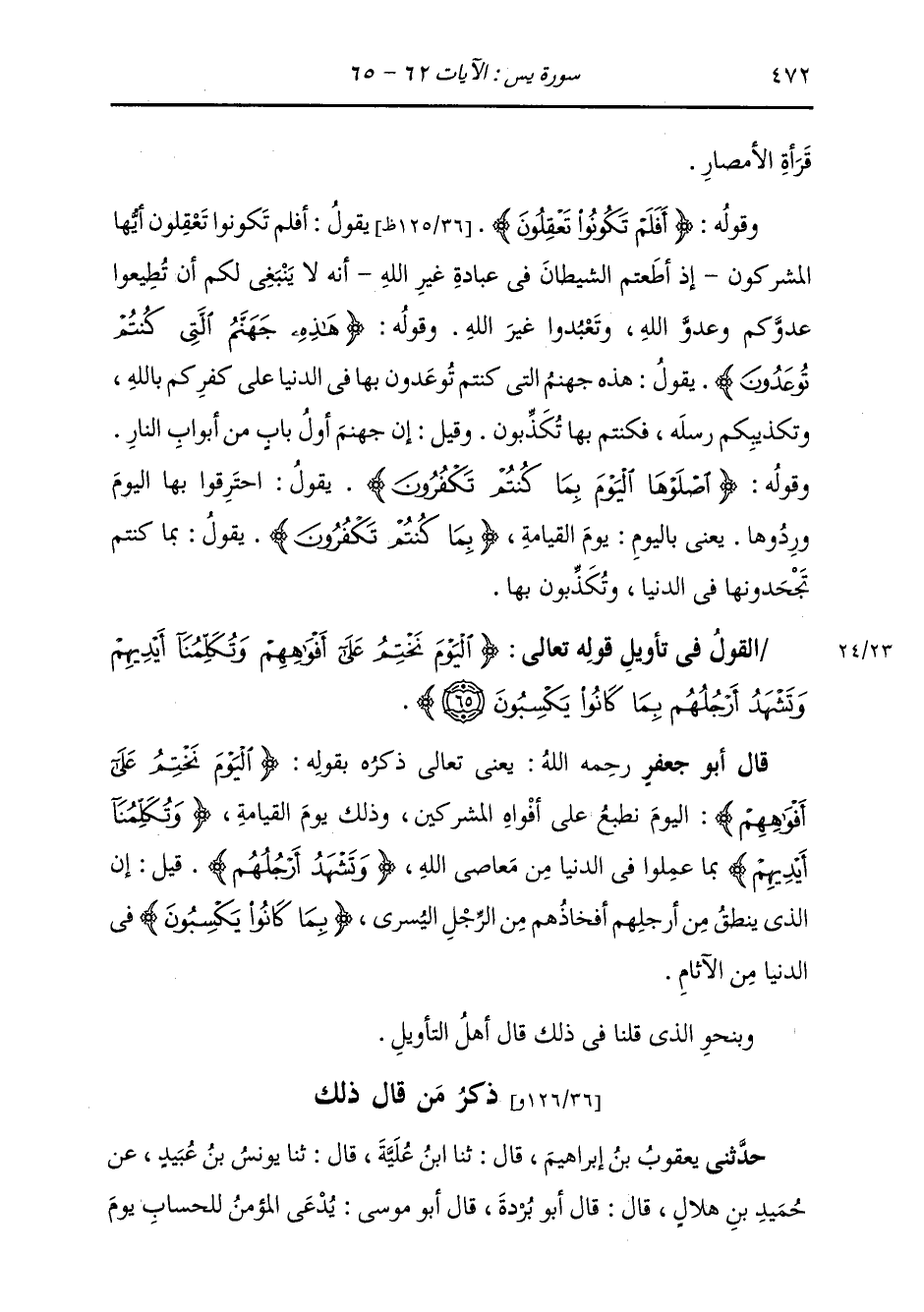 §الْقَوْلُ فِي تَأْوِيلِ قَوْلِهِ تَعَالَى: {الْيَوْمَ نَخْتِمُ عَلَى أَفْوَاهِهِمْ وَتُكَلِّمُنَا أَيْدِيهِمْ وَتَشْهَدُ أَرْجُلُهُمْ بِمَا كَانُوا يَكْسِبُونَ} [يس: 65] يَعْنِي تَعَالَى ذِكْرُهُ بِقَوْلِهِ: {الْيَوْمَ نَخْتِمُ عَلَى أَفْوَاهِهِمْ} [يس: 65] الْيَوْمَ نَطْبَعُ عَلَى أَفْوَاهِ الْمُشْرِكِينَ، وَذَلِكَ يَوْمُ الْقِيَامَةِ {وَتُكَلِّمُنَا أَيْدِيهِمْ} [يس: 65] بِمَا عَمِلُوا فِي الدُّنْيَا مِنْ مَعَاصِي اللَّهِ {وَتَشْهَدُ أَرْجُلُهُمْ} [يس: 65] قِيلَ: إِنَّ الَّذِي يَنْطِقُ مِنْ أَرْجُلِهِمْ: أَفْخَاذُهُمْ مِنَ الرِّجْلِ الْيُسْرَى {بِمَا كَانُوا يَكْسِبُونَ} [الأنعام: 129] فِي الدُّنْيَا مِنَ الْآثَامِ وَبِنَحْوِ الَّذِي قُلْنَا فِي ذَلِكَ قَالَ أَهْلُ التَّأْوِيلِ