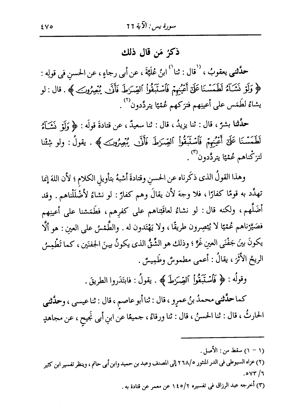 حَدَّثَنَا بِشْرٌ، قَالَ: ثنا يَزِيدُ، قَالَ: ثنا سَعِيدٌ، عَنْ قَتَادَةَ، قَوْلُهُ: {§وَلَوْ نَشَاءُ لَطَمَسْنَا عَلَى أَعْيُنِهِمْ فَاسْتَبَقُوا الصِّرَاطَ فَأَنَّى يُبْصِرُونَ} [يس: 66] يَقُولُ: «لَوْ شِئْنَا لَتَرَكْنَاهُمْ عُمْيًا يَتَرَدَّدُونَ» وَهَذَا الْقَوْلُ الَّذِي ذَكَرْنَاهُ عَنِ الْحَسَنِ وَقَتَادَةَ أَشْبَهُ بِتَأْوِيلِ الْكَلَامِ، لِأَنَّ اللَّهَ إِنَّمَا تَهَدَّدَ بِهِ قَوْمًا كُفَّارًا، فَلَا وَجْهَ لِأَنْ يُقَالَ: وَهُمْ كُفَّارٌ، لَوْ نَشَاءُ لَأَضْلَلْنَاهُمْ وَقَدْ أَضَلَّهُمْ، وَلَكِنَّهُ قَالَ: لَوْ نَشَاءُ لَعَاقَبْنَاهُمْ عَلَى كُفْرِهِمْ، فَطَمَسْنَا عَلَى أَعْيُنِهِمْ فَصَيَّرْنَاهُمْ عُمْيًا لَا يُبْصِرُونَ طَرِيقًا، وَلَا يَهْتَدُونَ لَهُ؛ وَالطَّمْسُ عَلَى الْعَيْنِ: هُوَ أَنْ لَا يَكُونَ بَيْنَ جَفْنَيِ الْعَيْنِ غُرٌّ، وَذَلِكَ هُوَ الشِّقُّ الَّذِي بَيْنَ الْجَفْنَيْنِ، كَمَا تَطْمِسُ الرِّيحُ الْأَثَرَ، يُقَالُ: أَعْمَى مَطْمُوسٌ وَطَمِيسٌ