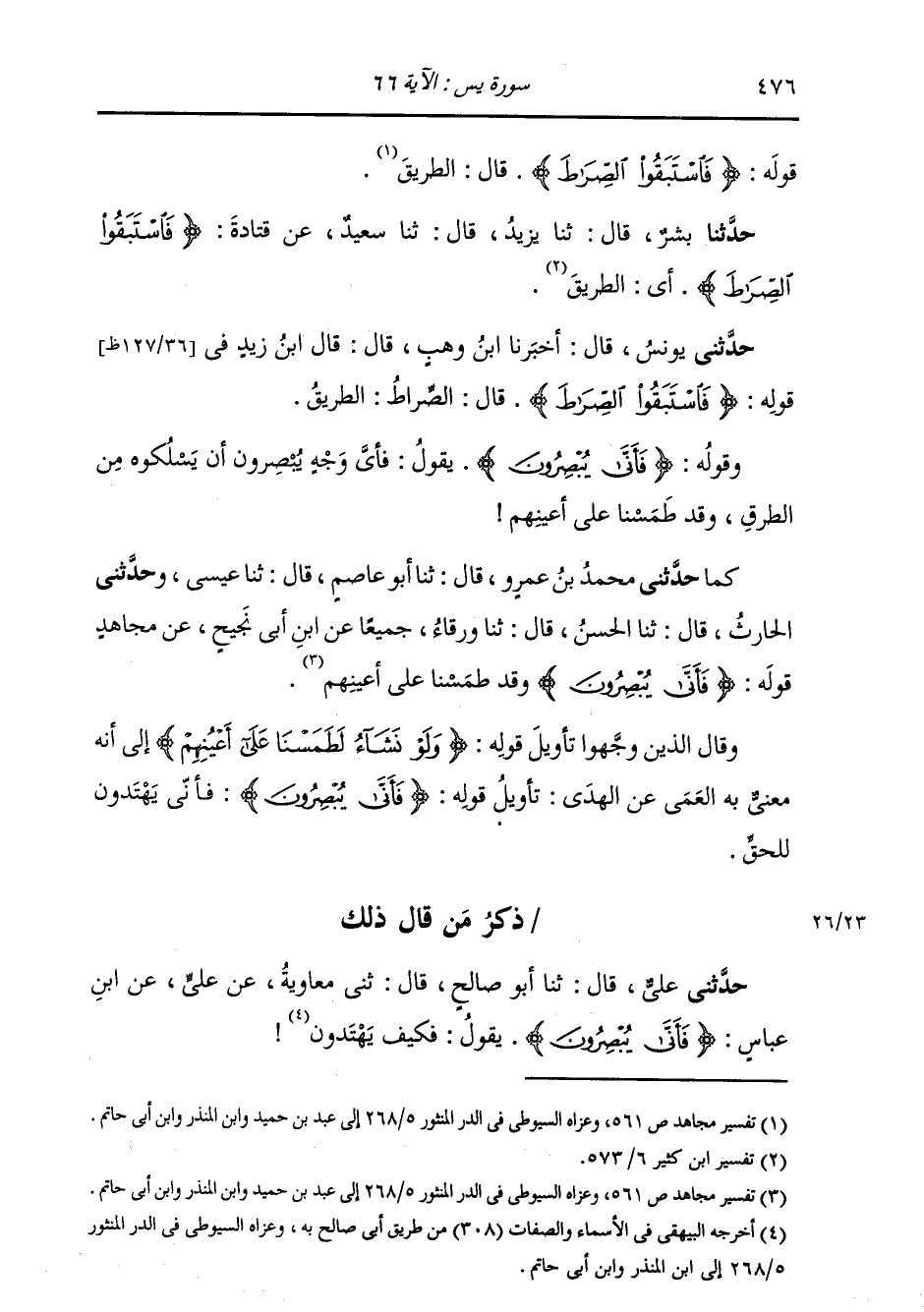 ذِكْرُ مَنْ قَالَ ذَلِكَ: حَدَّثَنِي عَلِيٌّ، قَالَ: ثنا أَبُو صَالِحٍ، قَالَ: ثني مُعَاوِيَةُ، عَنْ عَلِيٍّ، عَنِ ابْنِ عَبَّاسٍ {§فَأَنَّى يُبْصِرُونَ} [يس: 66] يَقُولُ: «فَكَيْفَ يَهْتَدُونَ»