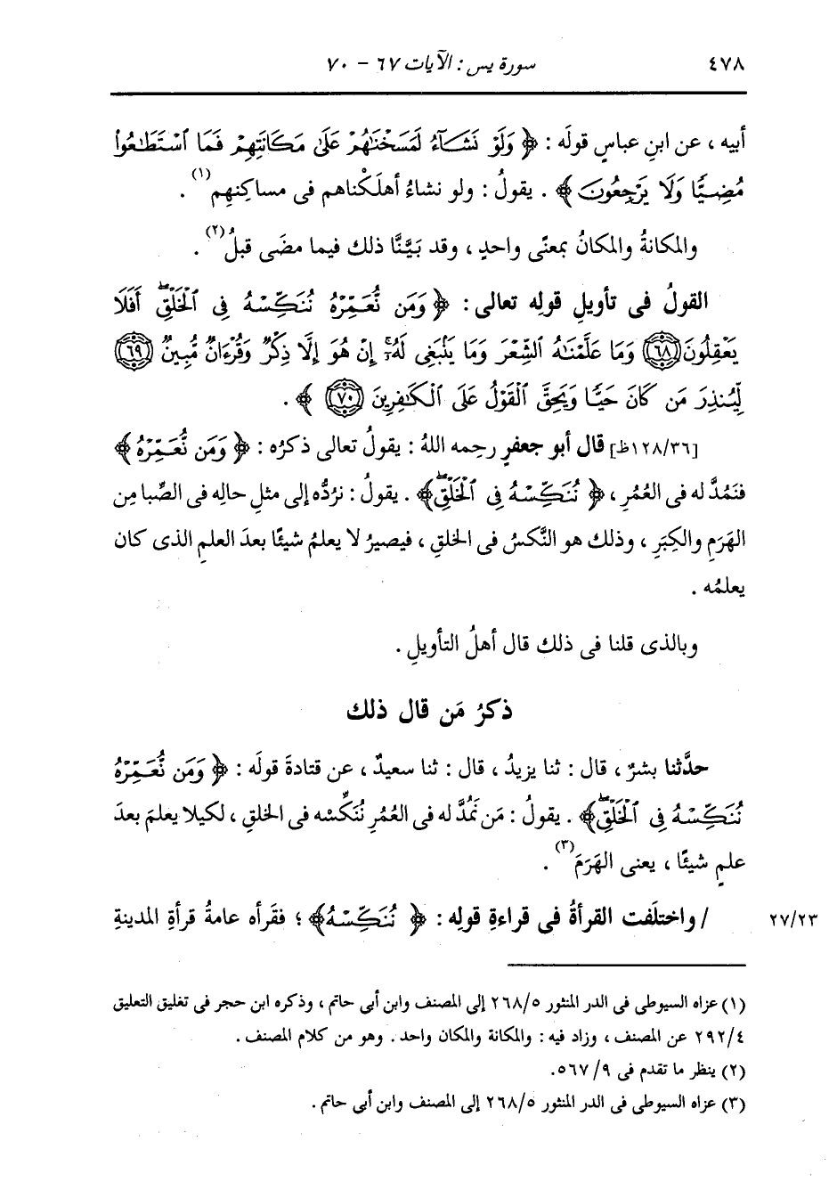 ذِكْرُ مَنْ قَالَ ذَلِكَ: حَدَّثَنَا بِشْرٌ، قَالَ: ثنا يَزِيدُ، قَالَ: ثنا سَعِيدٌ، عَنْ قَتَادَةَ، قَوْلُهُ: {§وَمَنْ نُعَمِّرْهُ نُنَكِّسْهُ فِي الْخَلْقِ} [يس: 68] يَقُولُ: «مَنْ نَمُدَّ لَهُ فِي الْعُمُرِ نُنَكِّسْهُ فِي الْخَلْقِ، لِكَيْ لَا يَعْلَمَ بَعْدَ عِلْمٍ شَيْئًا، يَعْنِي الْهَرَمَ» وَاخْتَلَفَتِ الْقُرَّاءُ فِي قِرَاءَةِ قَوْلِهِ: {نُنَكِّسْهُ} [يس: 68] فَقَرَأَهُ عَامَّةُ قُرَّاءِ الْمَدِينَةِ -[479]- وَالْبَصْرَةِ وَبَعْضُ الْكُوفِيِّينَ: «نَنْكِسْهُ» بِفَتْحِ النُّونِ الْأُولَى وَتَسْكِينِ الثَّانِيَةِ، وَقَرَأَتْهُ عَامَّةُ قُرَّاءِ الْكُوفَةِ: {نُنَكِّسْهُ} [يس: 68] بِضَمِّ النُّونِ الْأُولَى وَفَتْحِ الثَّانِيَةِ وَتَشْدِيدِ الْكَافِ، وَالصَّوَابُ مِنَ الْقَوْلِ فِي ذَلِكَ أَنَّهُمَا قِرَاءَتَانِ مَشْهُورَتَانِ فِي قُرَّاءِ الْأَمْصَارِ، فَبِأَيَّتِهِمَا قَرَأَ الْقَارِئُ فَمُصِيبٌ، غَيْرَ أَنَّ الَّتِيَ عَلَيْهَا عَامَّةُ قُرَّاءِ الْكُوفِيِّينَ أَعْجَبُ إِلَيَّ، لِأَنَّ التَّنْكِيسَ مِنَ اللَّهِ فِي الْخَلْقِ إِنَّمَا هُوَ حَالٌ بَعْدَ حَالٍ، وَشَيْءٌ بَعْدَ شَيْءٍ، فَذَلِكَ تَأْيِيدٌ لِلتَّشْدِيدِ وَكَذَلِكَ اخْتَلَفُوا فِي قِرَاءَةِ قَوْلِهِ: {أَفَلَا يَعْقِلُونَ} [يس: 68] فَقَرَأَتْهُ قُرَّاءُ الْمَدِينَةِ: (أَفَلَا تَعْقِلُونَ) بِالتَّاءِ عَلَى وَجْهِ الْخِطَابِ وَقَرَأَتْهُ قُرَّاءُ الْكُوفَةِ بِالْيَاءِ عَلَى الْخَبَرِ، وَقِرَاءَةُ ذَلِكَ بِالْيَاءِ أَشْبَهُ بِظَاهِرِ التَّنْزِيلِ، لِأَنَّهُ احْتِجَاجٌ مِنَ اللَّهِ عَلَى الْمُشْرِكِينَ الَّذِينَ قَالَ فِيهِمْ {وَلَوْ نَشَاءُ لَطَمَسْنَا عَلَى أَعْيُنِهِمْ} [يس: 66] فِإِخْرَاجُ ذَلِكَ خَبَرًا عَلَى نَحْوِ مَا خَرَجَ قَوْلُهُ: {لَطَمَسْنَا عَلَى أَعْيُنِهِمْ} [يس: 66] أَعْجَبُ إِلَيَّ، وَإِنْ كَانَ الْآخَرُ غَيْرَ مَدْفُوعٍ وَيَعْنِي تَعَالَى ذِكْرُهُ بِقَوْلِهِ: {أَفَلَا يَعْقِلُونَ} [يس: 68] أَفَلَا يَعْقِلُ هَؤُلَاءِ الْمُشْرِكُونَ قُدْرَةَ اللَّهِ عَلَى مَا يَشَاءُ بِمُعَايَنَتِهِمْ مَا يُعَايِنُونَ مِنْ تَصْرِيفِهِ خَلْقِهِ فِيمَا شَاءَ وَأَحَبَّ مِنْ -[480]- صِغَرٍ إِلَى كِبَرٍ، وَمِنْ تَنْكِيسٍ بَعْدَ كِبَرٍ فِي هَرَمٍ