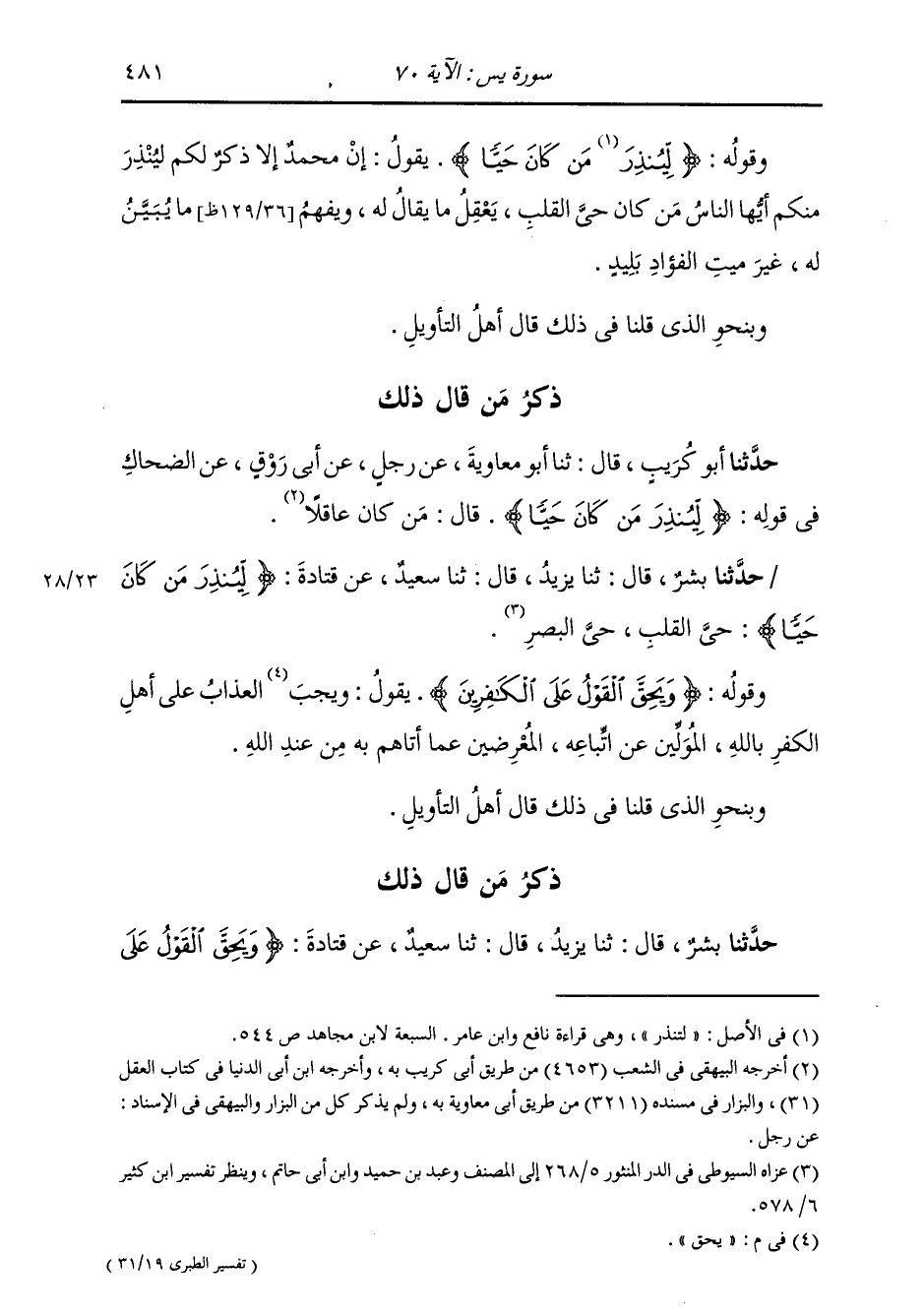 §وَقَوْلُهُ: {لِيُنْذِرَ مَنْ كَانَ حَيًّا} [يس: 70] يَقُولُ: إِنْ مُحَمَّدٌ إِلَّا ذِكْرٌ لَكُمْ لِيُنْذِرَ مِنْكُمْ أَيُّهَا النَّاسُ مَنْ كَانَ حَيَّ الْقَلْبِ، يَعْقِلُ مَا يُقَالُ لَهُ، وَيَفْهَمُ مَا يُبَيِّنُ لَهُ، غَيْرُ مَيِّتِ الْفُؤَادِ بَلِيدٌ وَبِنَحْوِ الَّذِي قُلْنَا فِي ذَلِكَ قَالَ أَهْلُ التَّأْوِيلِ