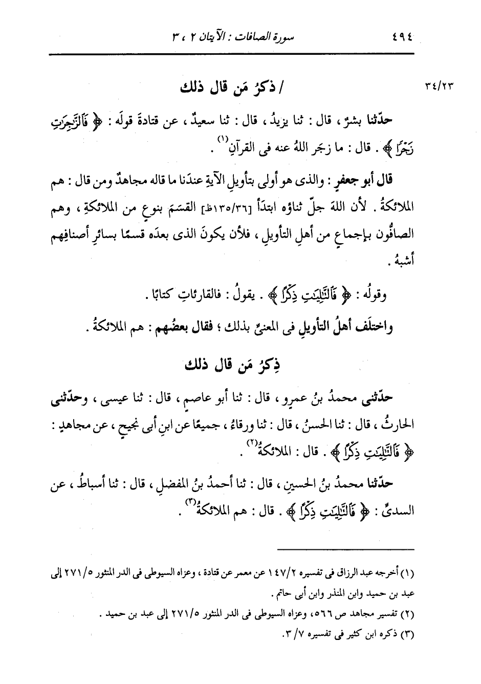 §وَقَوْلُهُ: {فَالتَّالِيَاتِ ذِكْرًا} [الصافات: 3] يَقُولُ: فَالْقَارِئَاتِ كِتَابًا وَاخْتَلَفَ أَهْلُ التَّأْوِيلِ فِي الْمَعْنِيِّ بِذَلِكَ، فَقَالَ بَعْضُهُمْ: هُمُ الْمَلَائِكَةُ