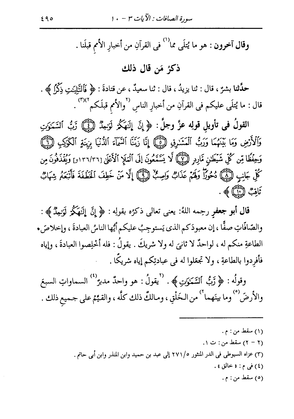 ذِكْرُ مَنْ قَالَ ذَلِكَ: حَدَّثَنَا بِشْرٌ، قَالَ: ثنا يَزِيدُ، قَالَ: ثنا سَعِيدٌ، عَنْ قَتَادَةَ {§فَالتَّالِيَاتِ ذِكْرًا} [الصافات: 3] قَالَ: «مَا يُتْلَى عَلَيْكُمْ فِي الْقُرْآنِ مِنْ أَخْبَارِ النَّاسِ وَالْأُمَمِ قَبْلَكُمْ»