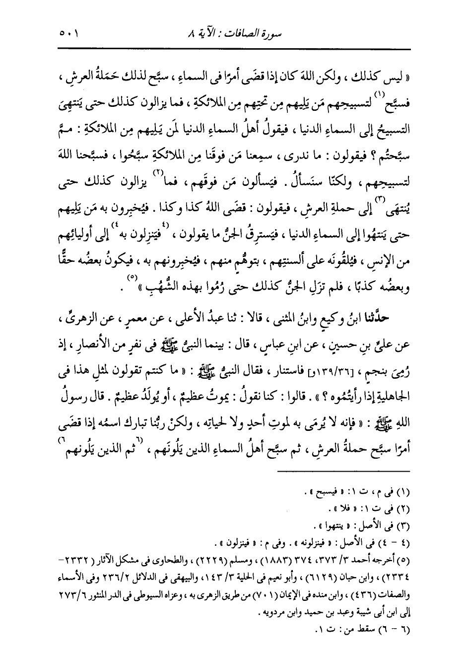 حَدَّثَنَا ابْنُ وَكِيعٍ، وَابْنُ الْمُثَنَّى، قَالَا: ثنا عَبْدُ الْأَعْلَى، عَنْ مَعْمَرٍ، عَنِ الزُّهْرِيِّ، عَنْ عَلِيِّ بْنِ حُسَيْنٍ، عَنِ ابْنِ عَبَّاسٍ، قَالَ بَيْنَمَا النَّبِيُّ صَلَّى اللهُ عَلَيْهِ وَسَلَّمَ فِي نَفَرٍ مِنَ الْأَنْصَارِ، إِذْ رُمِيَ بِنَجْمٍ فَاسْتَنَارَ، فَقَالَ النَّبِيُّ صَلَّى اللهُ عَلَيْهِ وَسَلَّمَ: «مَا كُنْتُمْ تَقُولُونَ لِمِثْلِ هَذَا فِي الْجَاهِلِيَّةِ إِذَا رَأَيْتُمُوهُ؟» قَالُوا: كُنَّا نَقُولُ: يَمُوتُ عَظِيمٌ أَوْ يُولَدُ عَظِيمٌ، قَالَ رَسُولُ اللَّهِ صَلَّى اللهُ عَلَيْهِ وَسَلَّمَ: " فَإِنَّهُ §لَا يُرْمَى بِهِ لِمَوْتِ أَحَدٍ وَلَا لِحَيَاتِهِ، وَلَكِنَّ رَبَّنَا تَبَارَكَ اسْمُهُ إِذَا قَضَى أَمْرًا سَبَّحَ حَمَلَةُ الْعَرْشِ، ثُمَّ سَبَّحَ أَهْلُ السَّمَاءِ الَّذِي يَلُونَهُمْ، ثُمَّ الَّذِينَ يَلُونَهُمْ -[502]- حَتَّى يَبْلُغَ التَّسْبِيحُ أَهْلَ هَذِهِ السَّمَاءِ ثُمَّ يَسْأَلُ أَهْلُ السَّمَاءِ السَّابِعَةِ حَمَلَةَ الْعَرْشِ: مَاذَا قَالَ رَبَّنَا؟ فَيُخْبِرُونَهُمْ، ثُمَّ يَسْتَخْبِرُ أَهْلُ كُلِّ سَمَاءٍ، حَتَّى يَبْلَعَ الْخَبَرُ أَهْلَ السَّمَاءِ الدُّنْيَا، وَتَّخَطَّفُ الشَّيَاطِينُ السَّمْعَ، فَيُرْمُونَ، فَيَقْذِفُونَهُ إِلَى أَوْلِيَائِهِمْ، فَمَا جَاءُوا بِهِ عَلَى وَجْهِهِ فَهُوَ حَقٌّ، وَلَكِنَّهُمْ يَزِيدُونَ " حَدَّثَنَا ابْنُ الْمُثَنَّى، قَالَ: ثنا مُحَمَّدُ بْنُ جَعْفَرٍ، قَالَ: أَخْبَرَنَا مَعْمَرٌ، قَالَ: ثنا ابْنُ شِهَابٍ، عَنْ عَلِيِّ بْنِ حُسَيْنٍ، عَنِ ابْنِ عَبَّاسٍ قَالَ: كَانَ رَسُولُ اللَّهِ صَلَّى اللهُ عَلَيْهِ وَسَلَّمَ جَالِسًا فِي نَفَرٍ مِنْ أَصْحَابِهِ، قَالَ: فَرُمِيَ بِنَجْمٍ، ثُمَّ ذَكَرَ نَحْوَهُ، إِلَّا أَنَّهُ زَادَ فِيهِ: قُلْتُ لِلزُّهْرِيِّ: أَكَانَ يُرْمَى بِهَا فِي الْجَاهِلِيَّةِ؟ قَالَ: نَعَمْ، وَلَكِنَّهَا غُلِّظَتْ حِينَ بُعِثَ النَّبِيُّ صَلَّى اللهُ عَلَيْهِ وَسَلَّمَ