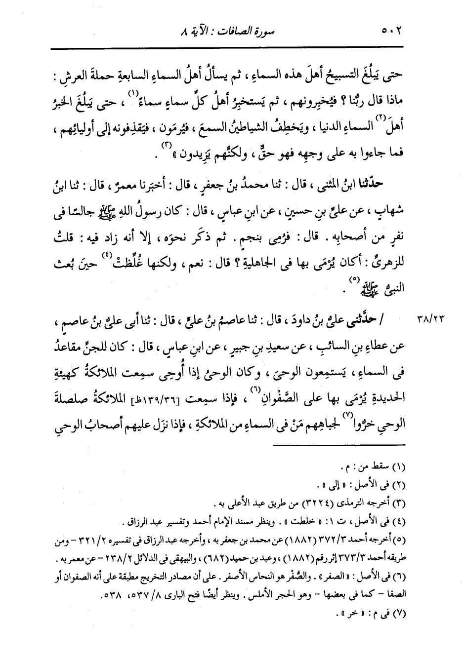حَدَّثَنِي عَلِيُّ بْنُ دَاوُدَ، قَالَ: ثنا عَاصِمُ بْنُ عَلِيٍّ، قَالَ: ثنا أَبِي عَلِيُّ بْنُ عَاصِمٍ، عَنْ عَطَاءِ بْنِ السَّائِبِ، عَنْ سَعِيدِ بْنِ جُبَيْرٍ، عَنِ ابْنِ عَبَّاسٍ، قَالَ: " §كَانَ لِلْجِنِّ مَقَاعِدُ فِي السَّمَاءِ يَسْمَعُونَ الْوَحْيَ، وَكَانَ الْوَحْيُ إِذَا أُوحِيَ سَمِعَتِ الْمَلَائِكَةُ كَهَيْئَةِ الْحَدِيدَةِ يُرْمَى بِهَا عَلَى الصَّفْوَانِ، فَإِذَا سَمِعَتِ الْمَلَائِكَةُ صَلْصَلَةَ الْوَحْيِ خَرَّ لِجِبَاهِهِمْ مَنْ فِي السَّمَاءِ مِنَ الْمَلَائِكَةِ، فَإِذَا نَزَلَ عَلَيْهِمْ أَصْحَابُ الْوَحْيِ -[503]- {قَالُوا مَاذَا قَالَ رَبُّكُمْ قَالُوا الْحَقَّ وَهُوَ الْعَلِيُّ الْكَبِيرُ} [سبأ: 23] ، قَالَ: فَيَتَنَادَوْنَ، قَالَ رَبُّكُمُ الْحَقَّ وَهُوَ الْعَلِيُّ الْكَبِيرُ؛ قَالَ: فَإِذَا أُنْزِلَ إِلَى السَّمَاءِ الدُّنْيَا، قَالُوا: يَكُونُ فِي الْأَرْضِ كَذَا وَكَذَا مَوْتًا، وَكَذَا وَكَذَا حَيَاةً وَكَذَا وَكَذَا جُدُوبَةً، وَكَذَا وَكَذَا خِصْبًا، وَمَا يُرِيدُ أَنْ يَصْنَعَ وَمَا يُرِيدُ أَنْ يَبْتَدِئَ تَبَارَكَ وَتَعَالَى، فَنَزَلَتِ الْجِنُّ فَأَوْحَوْا إِلَى أَوْلِيَائِهِمْ مِنَ الْإِنْسِ، مِمَّا يَكُونُ فِي الْأَرْضِ، فَبَيْنَاهُمْ كَذَلِكَ، إِذْ بَعَثَ اللَّهُ النَّبِيَّ صَلَّى اللهُ عَلَيْهِ وَسَلَّمَ، فَزَجَرَتِ الشَّيَاطِينَ عَنِ السَّمَاءِ وَرَمُوهُمْ بِكَوَاكِبَ، فَجَعَلَ لَا يَصْعَدُ أَحَدٌ مِنْهُمْ إِلَّا احْتَرَقَ، وَفَزِعَ أَهْلُ الْأَرْضِ لِمَا رَأَوْا فِي الْكَوَاكِبِ، وَلَمْ يَكُنْ قَبْلَ ذَلِكَ، وَقَالُوا: هَلَكَ مَنْ فِي السَّمَاءِ، وَكَانَ أَهْلُ الطَّائِفِ أَوَّلَ مَنْ فَزِعَ، فَيَنْطَلِقُ الرَّجُلُ إِلَى إِبِلِهِ، فَيَنْحَرُ كُلَّ يَوْمٍ بَعِيرًا لِآلِهَتِهِمْ، وَيَنْطَلِقُ صَاحِبُ الْغَنَمِ، فَيَذْبَحُ كُلَّ يَوْمٍ شَاةً، وَيَنْطَلِقُ صَاحِبُ الْبَقَرِ فَيَذْبَحُ كُلَّ يَوْمٍ بَقَرَةً، فَقَالَ لَهُمْ رَجُلٌ: وَيْلَكُمْ لَا تَهْلِكُوا أَمْوَالَكُمْ، فَإِنَّ مَعَالِمَكُمْ مِنَ الْكَوَاكِبِ الَّتِي تَهْتَدُونَ بِهَا لَمْ يَسْقُطْ مِنْهَا شَيْءٌ، فَأَقْلَعُوا وَقَدْ أَسْرَعُوا فِي أَمْوَالِهِمْ وَقَالَ إِبْلِيسُ: حَدَثَ فِي الْأَرْضِ حَدَثٌ، فَأُتِيَ مِنْ كُلِّ أَرْضٍ بِتُرْبَةٍ، فَجَعَلَ لَا يُؤْتَى بِتُرْبَةِ أَرْضٍ إِلَّا شَمَّهَا، فَلَمَّا أُتِيَ بِتُرْبَةِ تِهَامَةَ قَالَ: هَاهُنَا حَدَثَ الْحَدَثُ، وَصَرَفَ اللَّهُ إِلَيْهِ نَفَرًا مِنَ الْجِنِّ وَهُوَ يَقْرَأُ الْقُرْآنَ، فَقَالُوا: {إِنَّا سَمِعْنَا قُرْآنًا عَجَبًا} [الجن: 1] ، حَتَّى خَتَمَ الْآيَةَ، فَوَلَّوْا إِلَى قَوْمِهِمْ مُنْذِرِينَ "