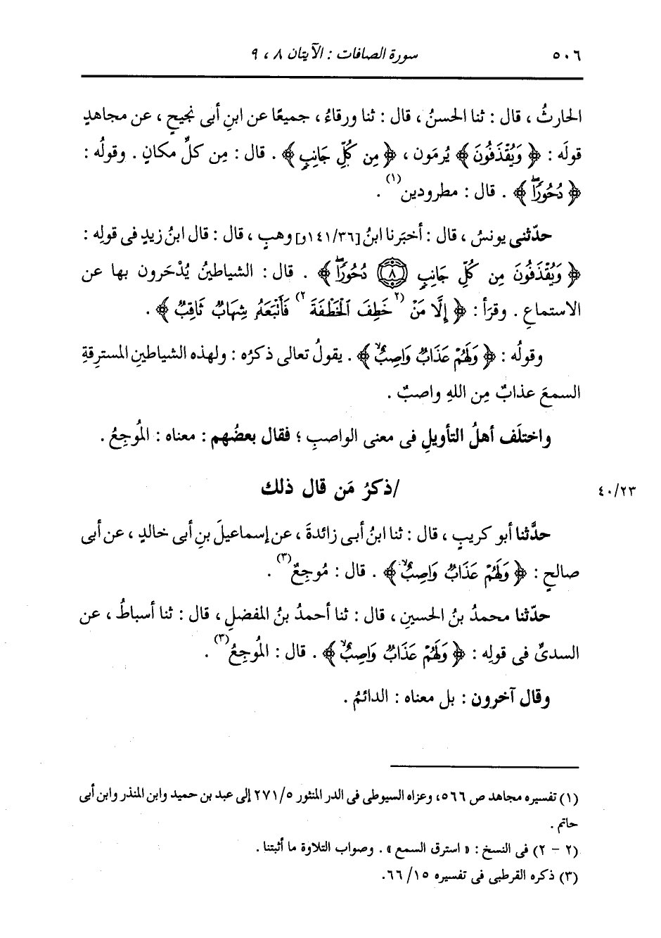 §وَقَوْلُهُ: {وَلَهُمْ عَذَابٌ وَاصِبٌ} [الصافات: 9] يَقُولُ تَعَالَى ذِكْرُهُ: وَلِهَذِهِ الشَّيَاطِينِ الْمُسْتَرِقَةِ السَّمْعَ عَذَابٌ مِنَ اللَّهِ وَاصِبٌ وَاخْتَلَفَ أَهْلُ التَّأْوِيلَ فِي مَعْنَى الْوَاصِبِ، فَقَالَ بَعْضُهُمْ: مَعْنَاهُ: الْمُوجِعُ