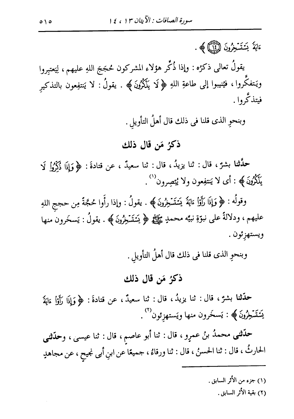 ذِكْرُ مَنْ قَالَ ذَلِكَ: حَدَّثَنَا بِشْرٌ، قَالَ: ثنا يَزِيدُ، قَالَ: ثنا سَعِيدٌ، عَنْ قَتَادَةَ {§وَإِذَا ذُكِّرُوا لَا يَذْكُرُونَ} [الصافات: 13] : «أَيْ لَا يَنْتَفِعُونَ وَلَا يُبْصِرُونَ»