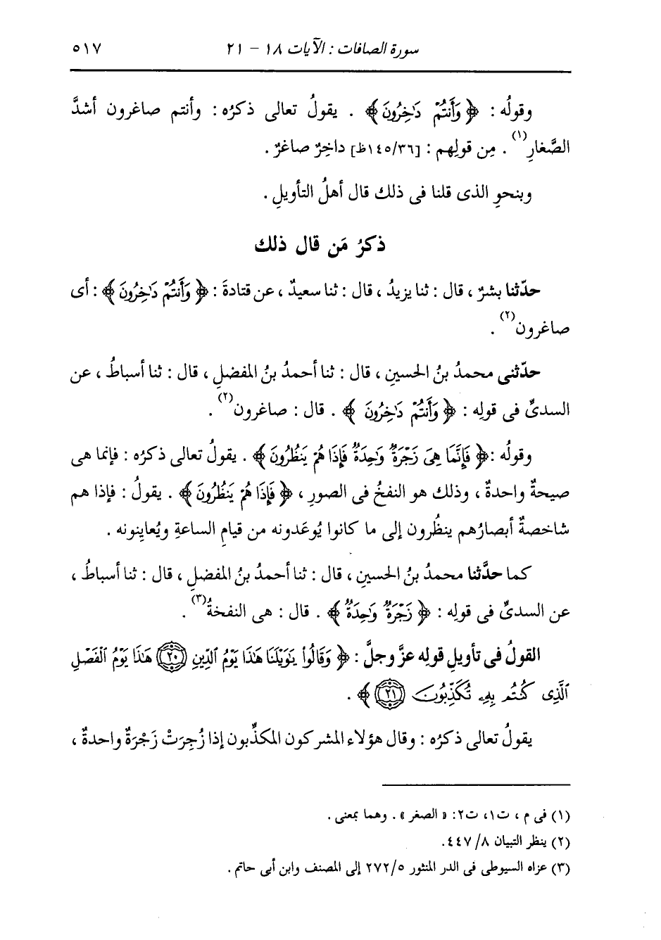 ذِكْرُ مَنْ قَالَ ذَلِكَ: حَدَّثَنَا بِشْرٌ، قَالَ: ثنا يَزِيدُ، قَالَ: ثنا سَعِيدٌ، عَنْ قَتَادَةَ {§وَأَنْتُمْ دَاخِرُونَ} [الصافات: 18] «أَيْ صَاغِرُونَ»