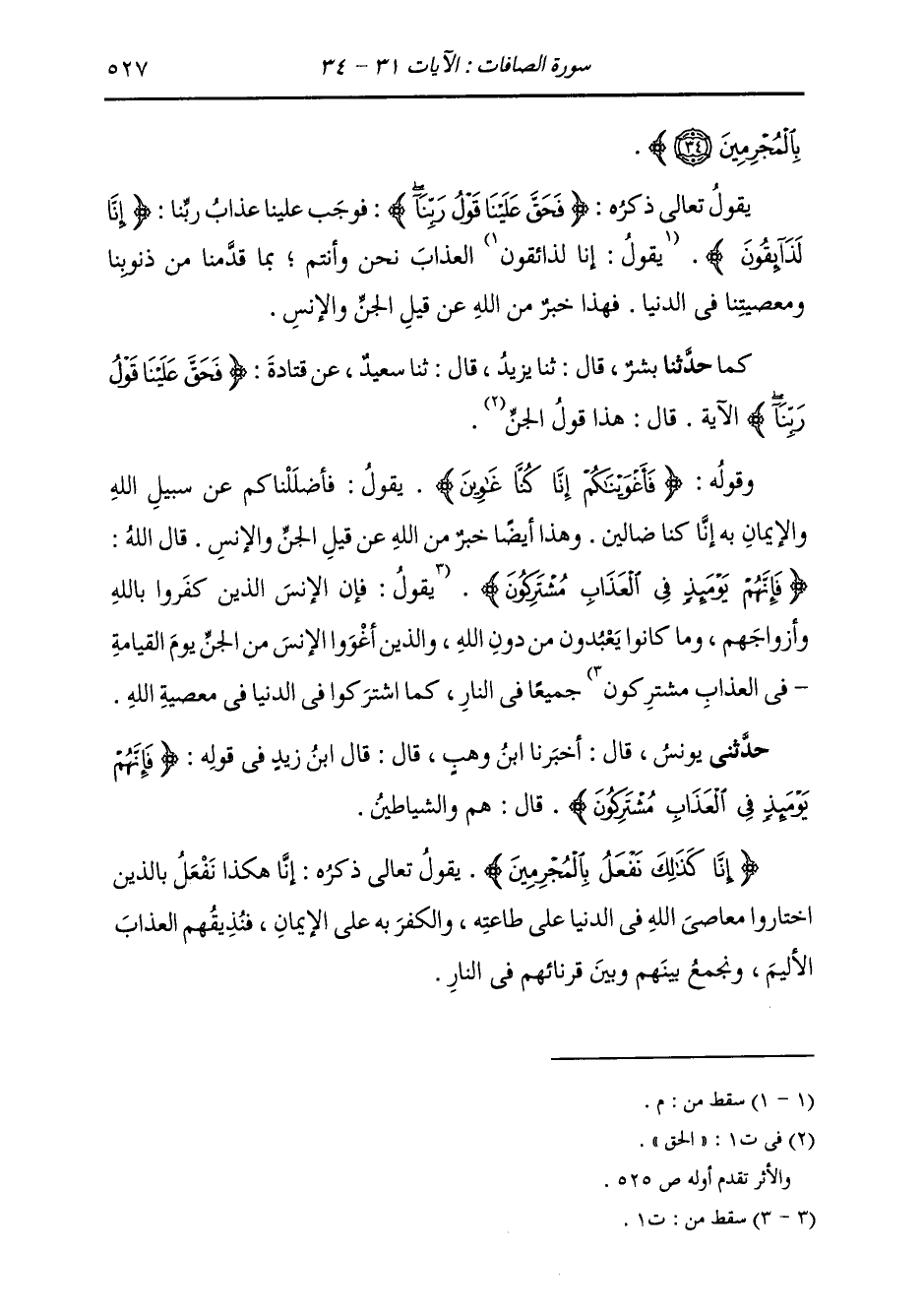 كَمَا: حَدَّثَنَا بِشْرٌ، قَالَ: ثنا يَزِيدُ، قَالَ: ثنا سَعِيدٌ، عَنْ قَتَادَةَ {§فَحَقَّ عَلَيْنَا قَوْلُ رَبِّنَا} [الصافات: 31] الْآيَةَ، قَالَ: «هَذَا قَوْلُ الْجِنِّ»