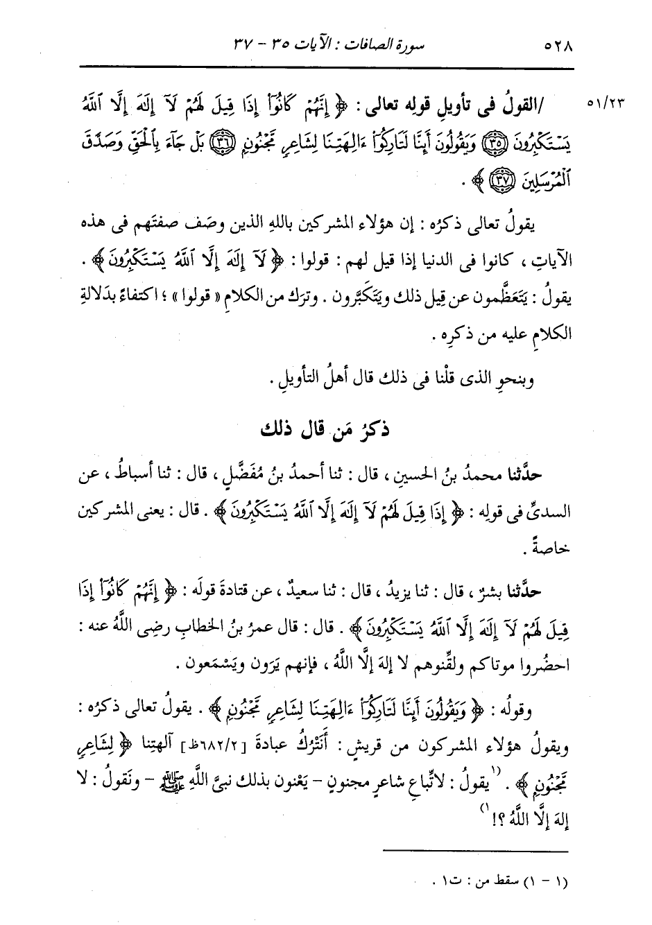 ذِكْرُ مَنْ قَالَ ذَلِكَ: حَدَّثَنَا مُحَمَّدُ بْنُ الْحُسَيْنِ، قَالَ: ثنا أَحْمَدُ بْنُ مُفَضَّلٍ، قَالَ: ثنا أَسْبَاطٌ، عَنِ السُّدِّيِّ، فِي قَوْلِهِ: {§إِذَا قِيلَ لَهُمْ لَا إِلَهَ إِلَّا اللَّهُ يَسْتَكْبِرُونَ} [الصافات: 35] قَالَ: «يَعْنِي الْمُشْرِكِينَ خَاصَّةً»
