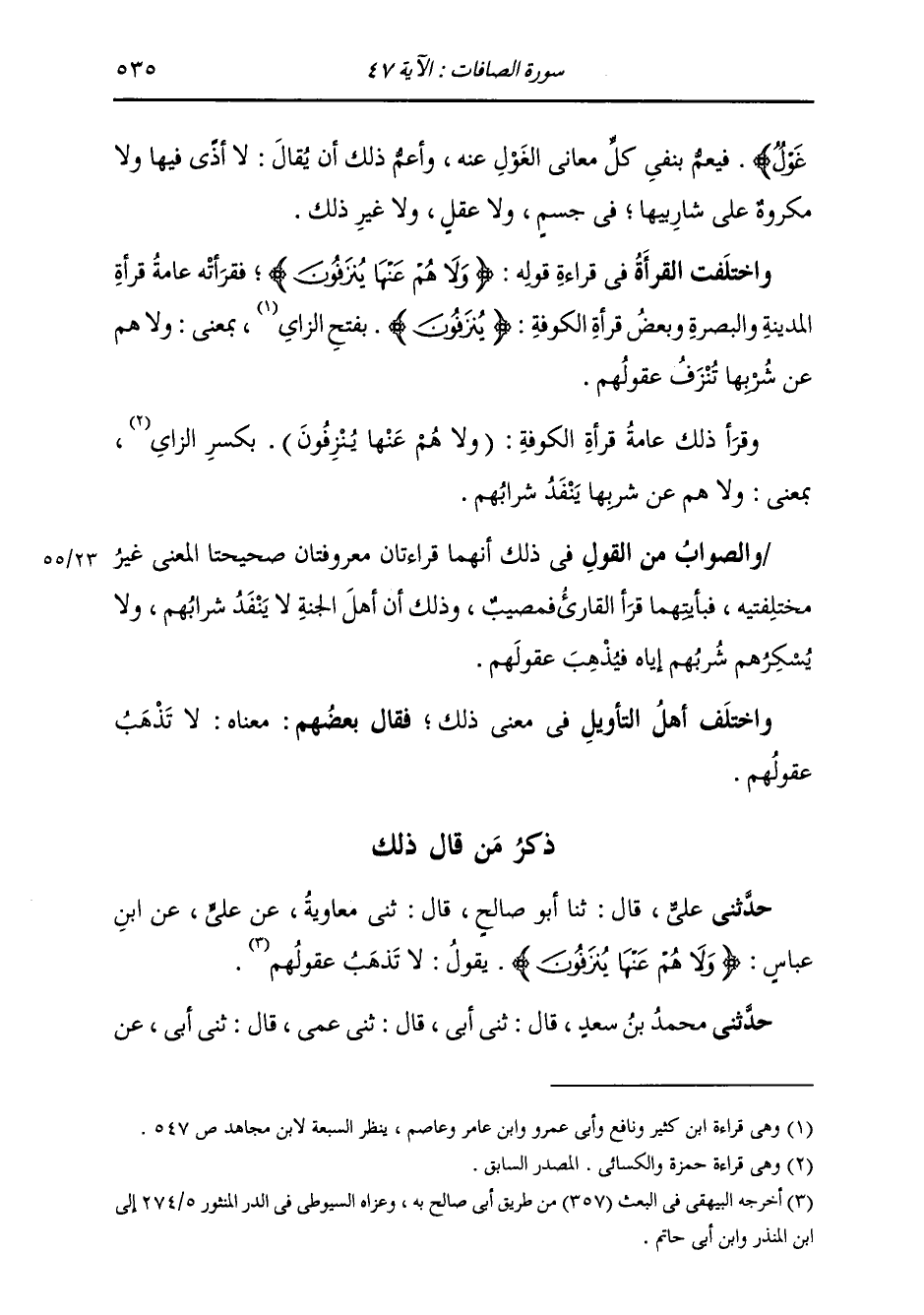 ذِكْرُ مَنْ قَالَ ذَلِكَ: حَدَّثَنِي عَلِيٌّ، قَالَ: ثنا أَبُو صَالِحٍ، قَالَ: ثني مُعَاوِيَةُ، عَنْ عَلِيٍّ، عَنِ ابْنِ عَبَّاسٍ {§وَلَا هُمْ عَنْهَا يُنْزَفُونَ} [الصافات: 47] يَقُولُ: «لَا تُذْهِبُ عُقُولَهُمْ»