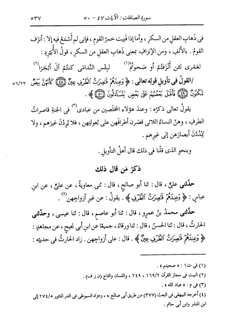 ذِكْرُ مَنْ قَالَ ذَلِكَ: حَدَّثَنِي عَلِيٌّ، قَالَ: ثنا أَبُو صَالِحٍ، قَالَ: ثني مُعَاوِيَةُ، عَنْ عَلِيٍّ، عَنِ ابْنِ عَبَّاسٍ، {وَعِنْدَهُمْ قَاصِرَاتُ الطَّرْفِ عِينٌ} [الصافات: 48] يَقُولُ: «§عَنْ غَيْرِ أَزْوَاجِهِنَّ»