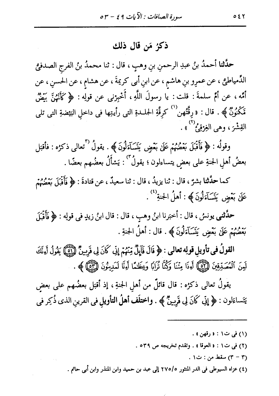 §الْقَوْلُ فِي تَأْوِيلِ قَوْلِهِ تَعَالَى: {قَالَ قَائِلٌ مِنْهُمْ إِنِّي كَانَ لِي قَرِينٌ يَقُولُ أَئِنَّكَ لَمِنَ الْمُصَدِّقِينَ، أَئِذَا مِتْنَا وَكُنَّا تُرَابًا وَعِظَامًا أَئِنَّا لَمَدِينُونَ} [الصافات: 52] يَقُولُ تَعَالَى ذِكْرُهُ: قَالَ قَائِلٌ مِنْ أَهْلِ الْجَنَّةِ إِذَا أَقْبَلَ بَعْضُهُمْ عَلَى بَعْضٍ يَتَسَاءَلُونَ: {إِنِّي كَانَ لِي قَرِينٌ} [الصافات: 51] فَاخْتَلَفَ أَهْلُ التَّأْوِيلِ فِي الْقَرِينِ الَّذِي ذُكِرَ فِي -[543]- هَذَا الْمَوْضِعِ، فَقَالَ بَعْضُهُمْ: كَانَ ذَلِكَ الْقَرِينَ شَيْطَانًا، وَهُوَ الَّذِي كَانَ يَقُولُ لَهُ: {أَئِنَّكَ لِمَنِ الْمُصَّدِّقِينَ} [الصافات: 52] بِالْبَعْثِ بَعْدَ الْمَمَاتِ
