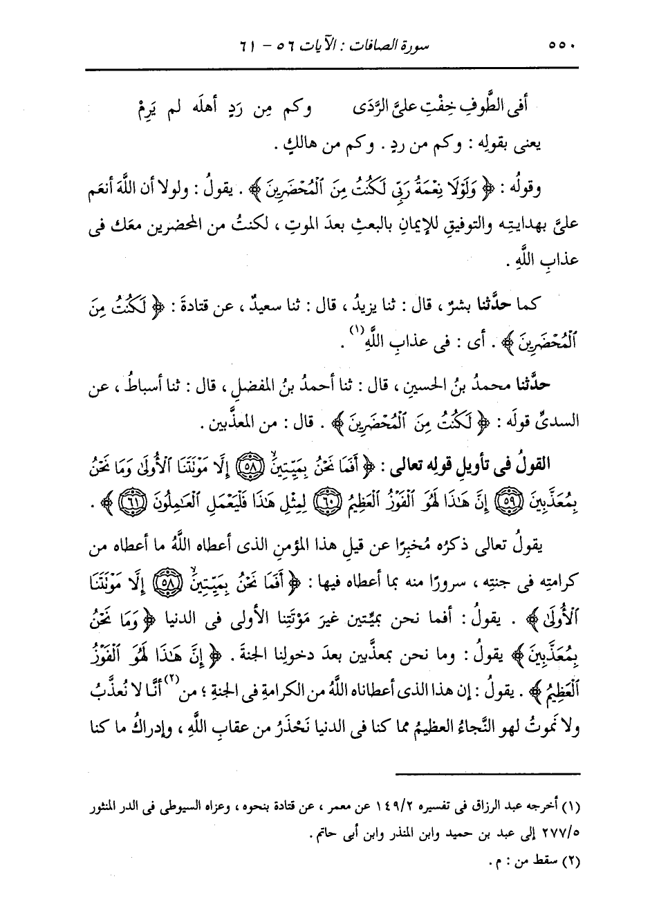 حَدَّثَنَا مُحَمَّدُ بْنُ الْحُسَيْنِ، قَالَ: ثنا أَحْمَدُ، قَالَ: ثنا أَسْبَاطٌ، عَنِ السُّدِّيِّ، قَوْلُهُ: {§لَكُنْتُ مِنَ الْمُحْضَرِينَ} [الصافات: 57] قَالَ: «مِنَ الْمُعَذَّبِينَ»