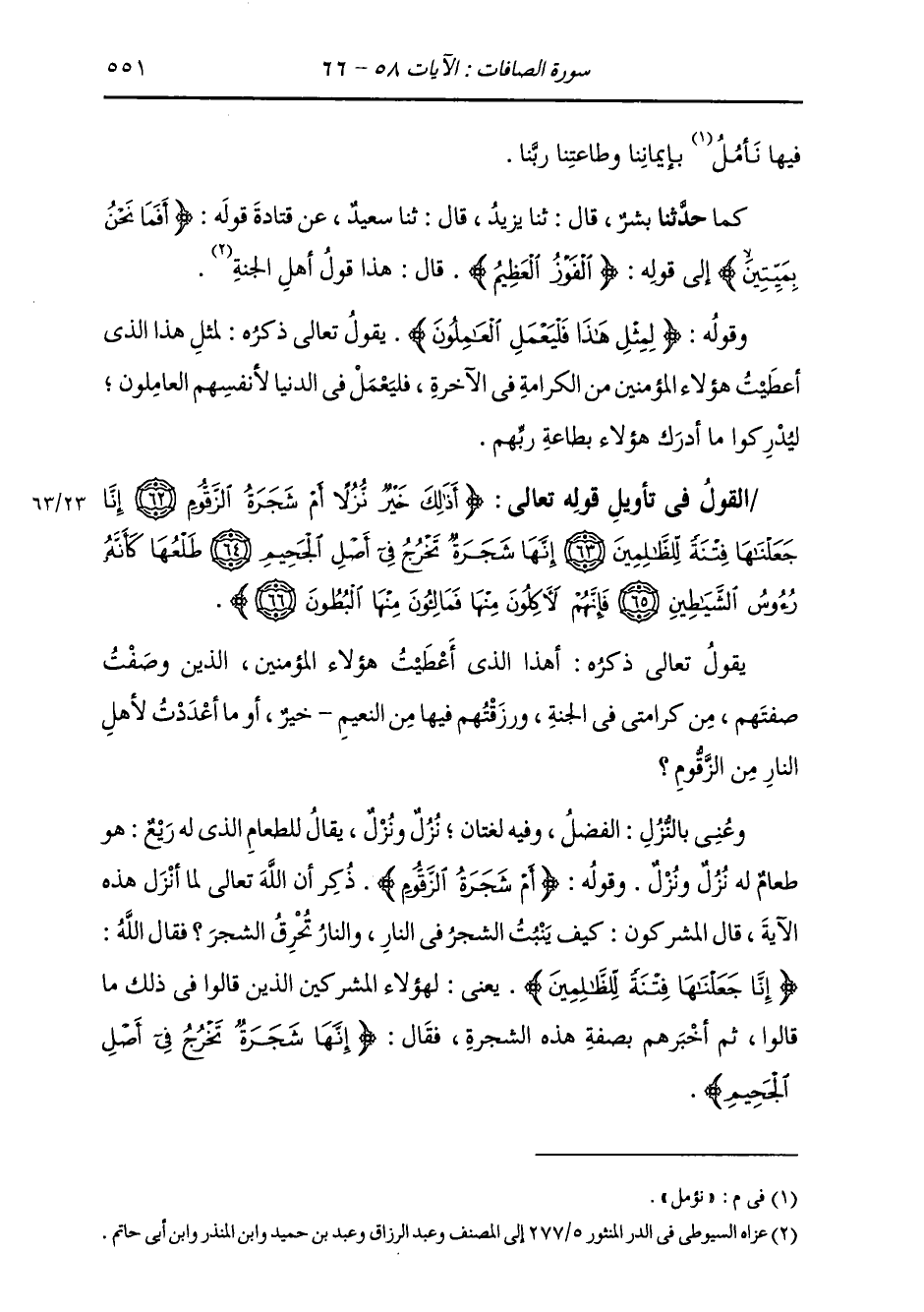 §الْقَوْلُ فِي تَأْوِيلِ قَوْلِهِ تَعَالَى: {أَذَلِكَ خَيْرٌ نُزُلًا أَمْ شَجَرَةُ الزَّقُّومِ إِنَّا جَعَلْنَاهَا فِتْنَةً لِلظَّالِمِينَ إِنَّهَا شَجَرَةٌ تَخْرُجُ فِي أَصْلِ الْجَحِيمِ طَلْعُهَا كَأَنَّهُ رُءُوسُ الشَّيَاطِينِ فَإِنَّهُمْ لَآكِلُونَ مِنْهَا فَمَالِئُونَ مِنْهَا الْبُطُونَ} يَقُولُ تَعَالَى ذِكْرُهُ: أَهَذَا الَّذِي أَعْطَيْتُ هَؤُلَاءِ الْمُؤْمِنِينَ الَّذِينَ وَصَفْتُ صِفَتَهُمْ مِنْ كَرَامَتِي فِي الْجَنَّةِ، وَرَزَقْتُهُمْ فِيهَا مِنَ النَّعِيمِ خَيْرٌ، أَوْ مَا أَعْدَدْتُ لِأَهْلِ النَّارِ مِنَ الزَّقُّومِ وَعَنَى بِالنُّزُلِ: الْفَضْلَ، وَفِيهِ لُغَتَانِ: نُزُلٌ وَنُزْلٌ؛ يُقَالُ لِلطَّعَامِ الَّذِي لَهُ رِيعٌ: هُوَ طَعَامٌ لَهُ نُزُلٌ وَنُزْلٌ