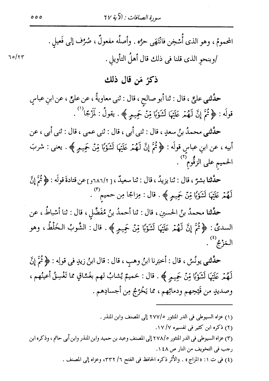 حَدَّثَنِي مُحَمَّدُ بْنُ سَعْدٍ، قَالَ: ثني أَبِي، قَالَ: ثني عَمِّي، قَالَ: ثني أَبِي، عَنْ أَبِيهِ، عَنِ ابْنِ عَبَّاسٍ، قَوْلُهُ: {§ثُمَّ إِنَّ لَهُمْ عَلَيْهَا لَشَوْبًا مِنْ حَمِيمٍ} [الصافات: 67] " يَعْنِي: شُرْبَ الْحَمِيمِ عَلَى الزَّقُّومِ "