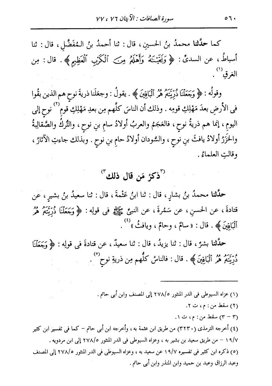 §وَقَوْلُهُ: {وَجَعَلْنَا ذُرِّيَّتَهُ هُمُ الْبَاقِينَ} [الصافات: 77] يَقُولُ: وَجَعَلْنَا ذُرِّيَّةَ نُوحٍ هُمُ الَّذِينَ بَقَوْا فِي الْأَرْضِ بَعْدَ مَهْلَكِ قَوْمِهِ، وَذَلِكَ أَنَّ النَّاسَ كُلَّهُمْ مِنْ بَعْدِ مَهْلَكِ نُوحٍ إِلَى الْيَوْمِ إِنَّمَا هُمْ ذُرِّيَّةُ نُوحٍ، فَالْعَجَمُ وَالْعَرَبُ أَوْلَادُ سَامِ بْنِ نُوحٍ، وَالتُّرْكُ وَالصَقَالِبَةُ وَالْخَزَرُ أَوْلَادُ يَافِثِ بْنِ نُوحٍ، وَالسُّودَانُ أَوْلَادُ حَامِ بْنِ نُوحٍ، وَبِذَلِكَ جَاءَتِ الْآثَارُ، وَقَالَتِ الْعُلَمَاءُ