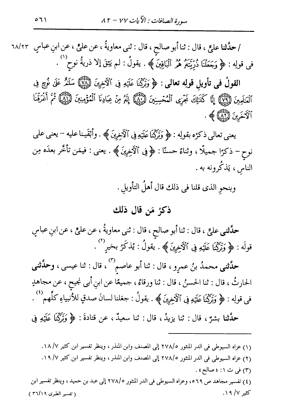 ذِكْرُ مَنْ قَالَ ذَلِكَ: حَدَّثَنِي عَلِيٌّ، قَالَ: ثنا أَبُو صَالِحٍ، قَالَ: ثني مُعَاوِيَةُ، عَنْ عَلِيٍّ، عَنِ ابْنِ عَبَّاسٍ، قَوْلُهُ: {وَتَرَكْنَا عَلَيْهِ فِي الْآخِرِينَ} [الصافات: 78] يَقُولُ: «§يُذْكَرُ بِخَيْرٍ»