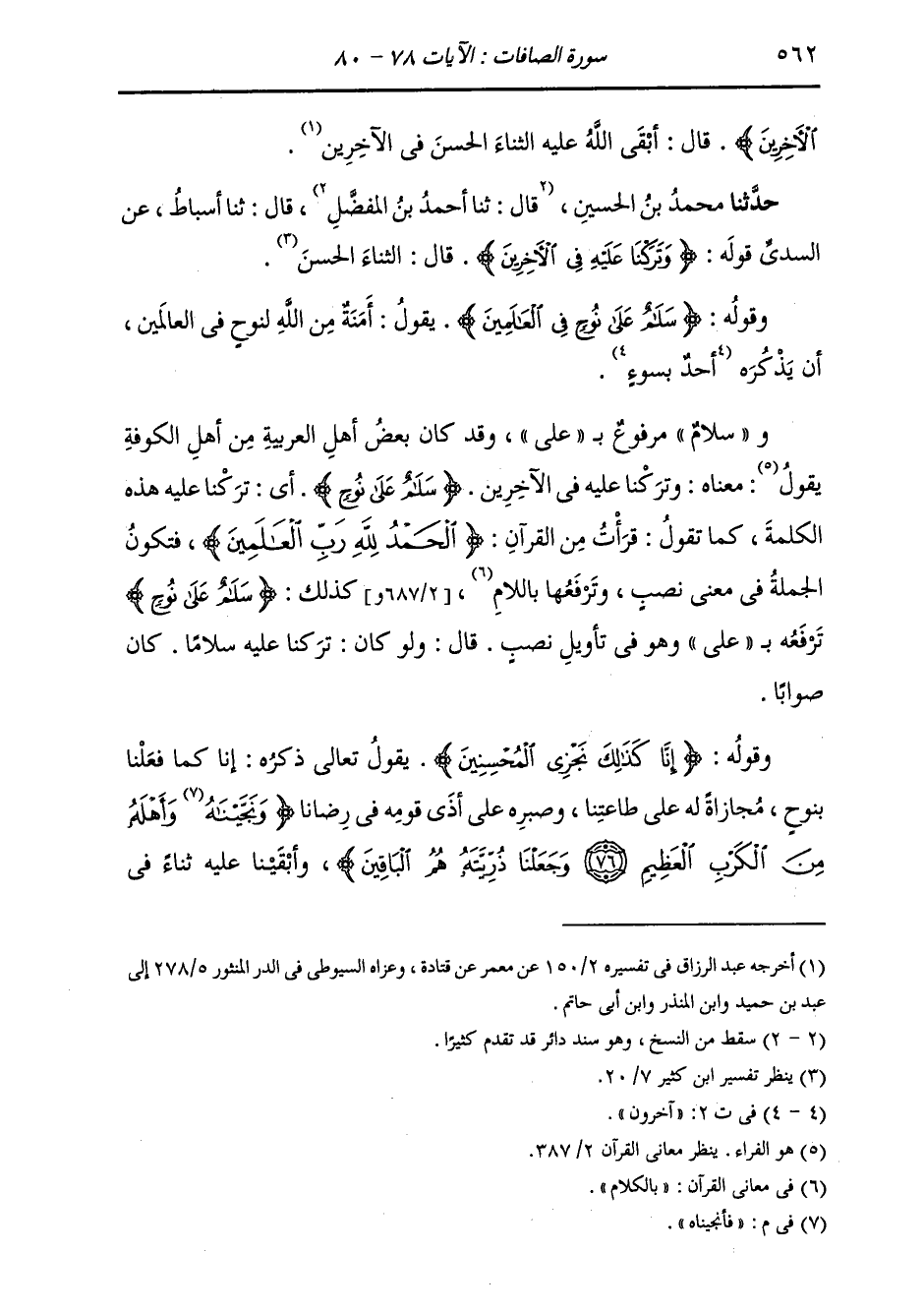 §وَقَوْلُهُ: {سَلَّامٌ عَلَى نُوحٍ فِي الْعَالَمِينَ} [الصافات: 79] يَقُولُ: أَمَنَةٌ مِنَ اللَّهِ لِنُوحٍ فِي الْعَالَمِينَ أَنْ يَذْكُرَهُ أَحَدٌ بِسُوءٍ؛ وَسَلَامٌ مَرْفُوعٌ بِعَلَى وَقَدْ كَانَ بَعْضُ أَهْلِ الْعَرَبِيَّةِ مِنْ أَهْلِ الْكُوفَةِ يَقُولُ: مَعْنَاهُ: وَتَرَكْنَا عَلَيْهِ فِي الْآخَرِينَ {سَلَّامٌ عَلَى نُوحٍ} [الصافات: 79] أَيْ تَرَكْنَا عَلَيْهِ هَذِهِ الْكَلِمَةَ، كَمَا تَقُولُ: قَرَأْتُ مِنَ الْقُرْآنِ {الْحَمْدُ لِلَّهِ رَبِّ الْعَالَمِينَ} [الفاتحة: 2] فَتَكُونُ الْجُمْلَةُ فِي مَعْنَى نَصَبٍ، وَتَرْفَعُهَا بِاللَّامِ، كَذَلِكَ سَلَّامٌ عَلَى نُوحٍ تَرْفَعُهُ بِعَلَى، وَهُوَ فِي تَأْوِيلِ نَصَبٍ، قَالَ: وَلَوْ كَانَ: تَرَكْنَا عَلَيْهِ سَلَّامًا، كَانَ صَوَابًا