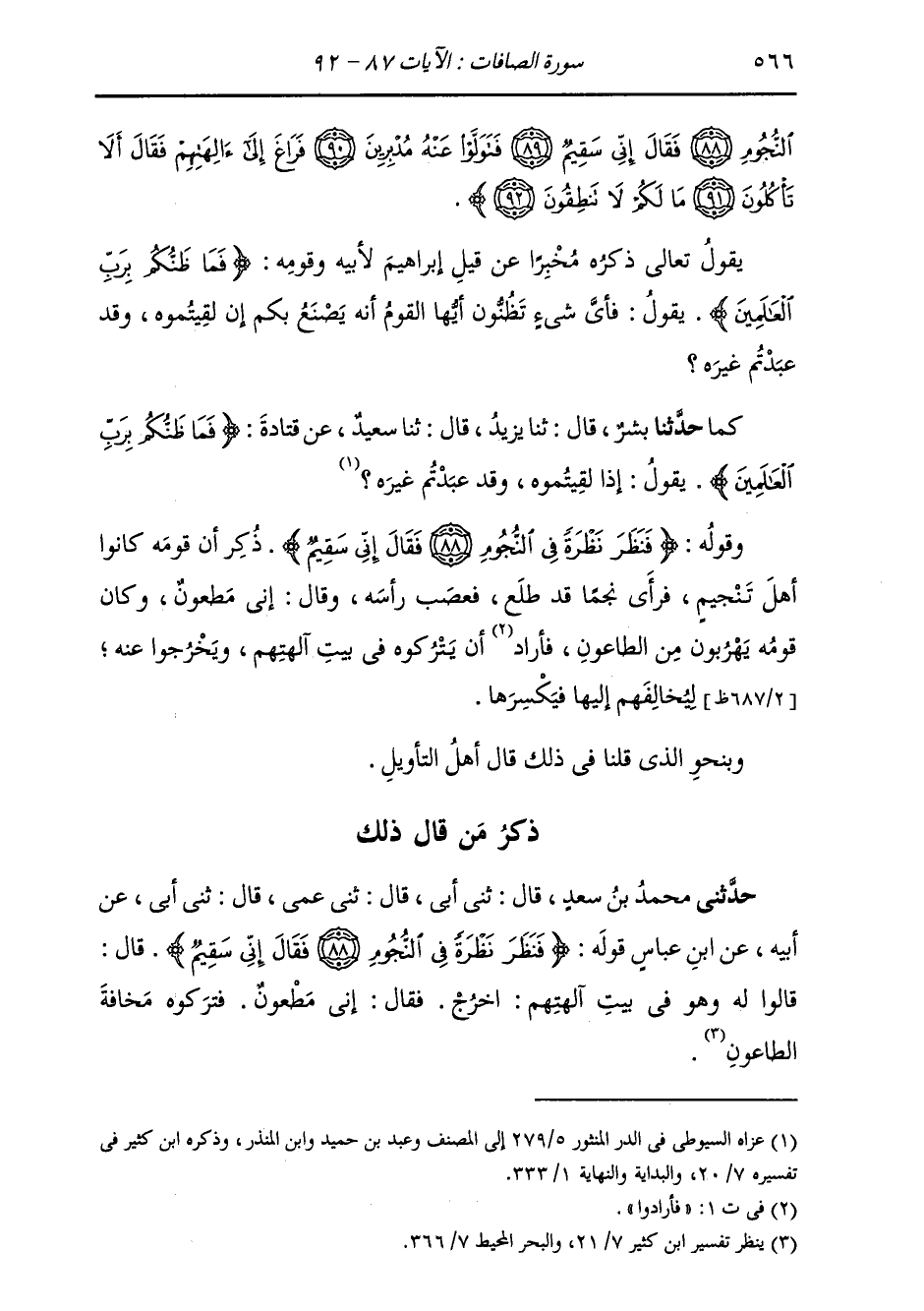 §وَقَوْلُهُ: {فَنَظَرَ نَظْرَةً فِي النُّجُومِ فَقَالَ إِنِّي سَقِيمٌ} [الصافات: 89] ذَكَرَ أَنَّ قَوْمَهُ كَانُوا أَهْلَ تَنْجِيمٍ، فَرَأَى نَجْمًا قَدْ طَلَعَ، فَعَصَبَ رَأْسَهُ وَقَالَ: إِنِّي مَطْعُونٌ، وَكَانَ قَوْمُهُ يَهْرَبُونَ مِنَ الطَّاعُونِ، فَأَرَادَ أَنْ يَتْرُكُوهُ فِي بَيْتِ آلِهَتِهِمْ، وَيَخْرُجُوا عَنْهُ، لِيُخَالِفَهُمْ إِلَيْهَا فَيَكْسِرُهَا وَبِنَحْوِ الَّذِي قُلْنَا فِي ذَلِكَ قَالَ أَهْلُ التَّأْوِيلِ