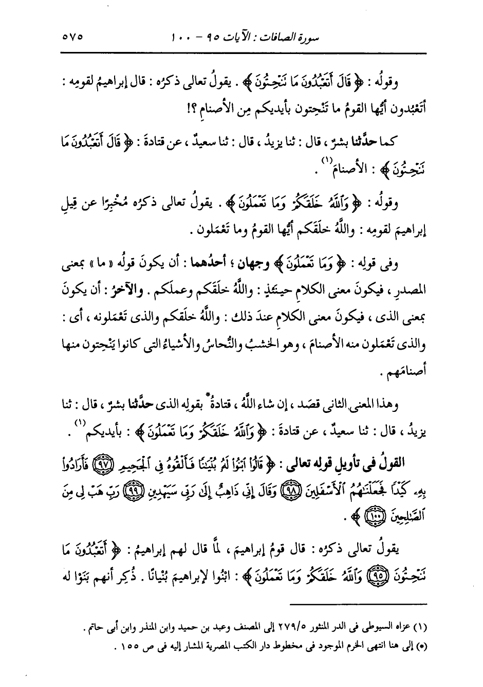 §وَقَوْلُهُ: {وَاللَّهُ خَلَقَكُمْ وَمَا تَعْمَلُونَ} [الصافات: 96] يَقُولُ تَعَالَى ذِكْرُهُ مُخْبِرًا عَنْ قِيلِ إِبْرَاهِيمَ لِقَوْمِهِ: وَاللَّهُ خَلَقَكُمْ أَيُّهَا الْقَوْمُ وَمَا تَعْمَلُونَ وَفِي قَوْلِهِ: {وَمَا تَعْمَلُونَ} [الصافات: 96] وَجْهَانِ: أَحَدُهُمَا: أَنْ يَكُونَ قَوْلُهُ: مَا بِمَعْنَى الْمَصْدَرِ، فَيَكُونُ مَعْنَى الْكَلَامِ حِينَئِذٍ: وَاللَّهُ خَلَقَكُمْ وَعَمَلَكُمْ وَالْآخَرُ أَنْ يَكُونَ بِمَعْنَى الَّذِي، فَيَكُونُ مَعْنَى الْكَلَامِ عِنْدَ ذَلِكَ: وَاللَّهُ خَلَقَكُمْ وَالَّذِي تَعْمَلُونَهُ: أَيْ وَالَّذِي تَعْمَلُونَ مِنْهُ الْأَصْنَامَ، وَهُوَ الْخَشَبُ وَالنَّحَاسُ وَالْأَشْيَاءُ الَّتِي كَانُوا يَنْحِتُونَ مِنْهَا أَصْنَامَهُمْ