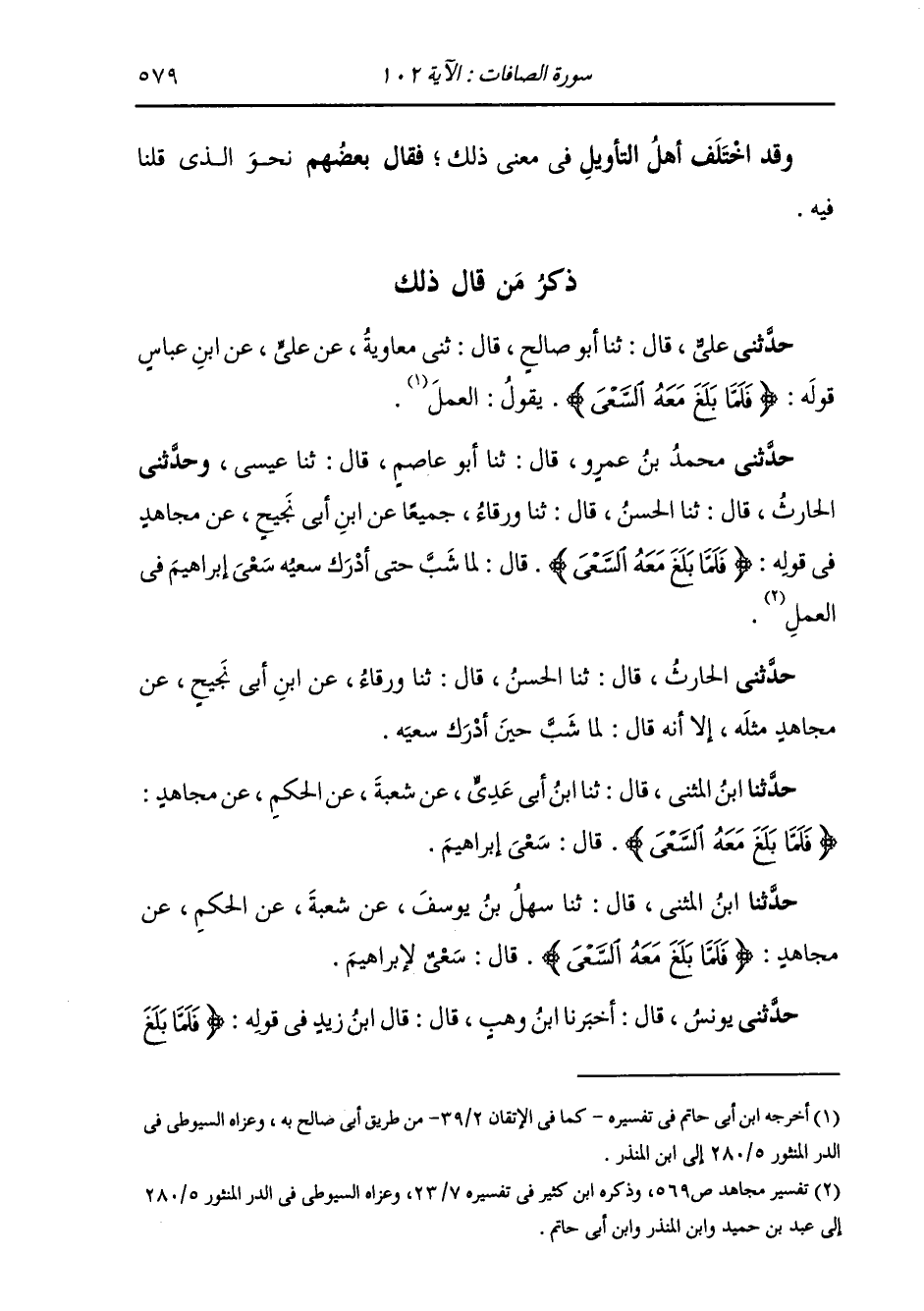 حَدَّثَنِي مُحَمَّدُ بْنُ عَمْرٍو، قَالَ: ثنا أَبُو عَاصِمٍ، قَالَ: ثنا عِيسَى، وَحَدَّثَنِي الْحَارِثُ، قَالَ: ثنا الْحَسَنُ، قَالَ: ثنا وَرْقَاءُ، جَمِيعًا عَنِ ابْنِ أَبِي نَجِيحٍ، عَنْ مُجَاهِدٍ، فِي قَوْلِهِ: {§فَلَمَّا بَلَغَ مَعَهُ السَّعْيَ} [الصافات: 102] قَالَ: «لَمَّا شَبَّ حَتَّى أَدْرَكَ سَعْيُهُ سَعْيَ إِبْرَاهِيمَ فِي الْعَمَلِ» حَدَّثَنِي الْحَارِثُ، قَالَ: ثنا الْحَسَنُ، قَالَ: ثنا وَرْقَاءُ، عَنِ ابْنِ أَبِي نَجِيحٍ، عَنْ مُجَاهِدٍ مِثْلُهُ، إِلَّا أَنَّهُ قَالَ: لَمَّا شَبَّ حِينَ أَدْرَكَ سَعْيَهُ