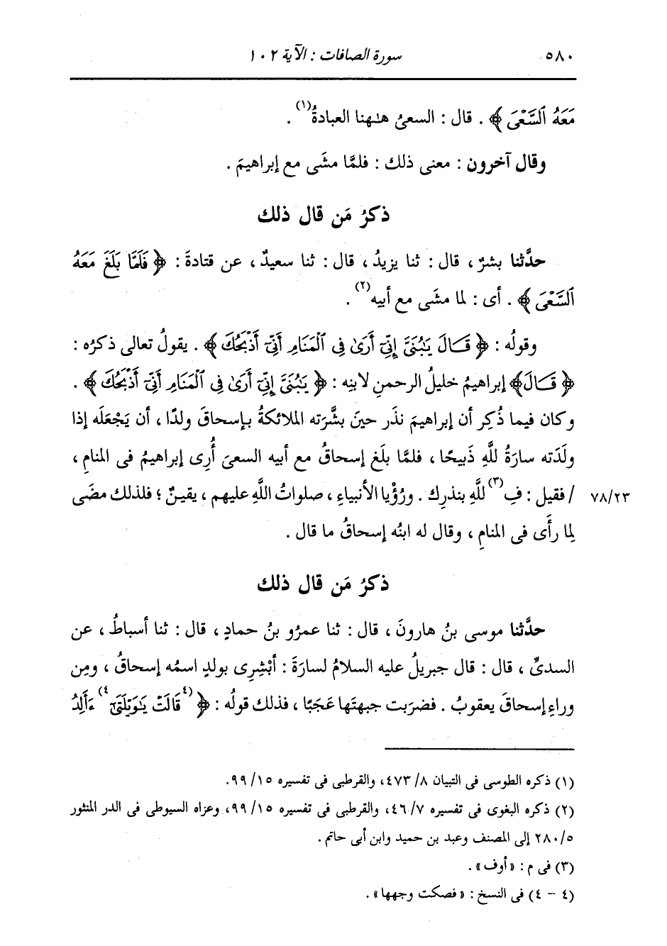 ذِكْرُ مَنْ قَالَ ذَلِكَ: حَدَّثَنَا بِشْرٌ، قَالَ: ثنا يَزِيدُ، قَالَ: ثنا سَعِيدٌ، عَنْ قَتَادَةَ {§فَلَمَّا بَلَغَ مَعَهُ السَّعْيَ} [الصافات: 102] «أَيْ لَمَّا مَشَى مَعَ أَبِيهِ»