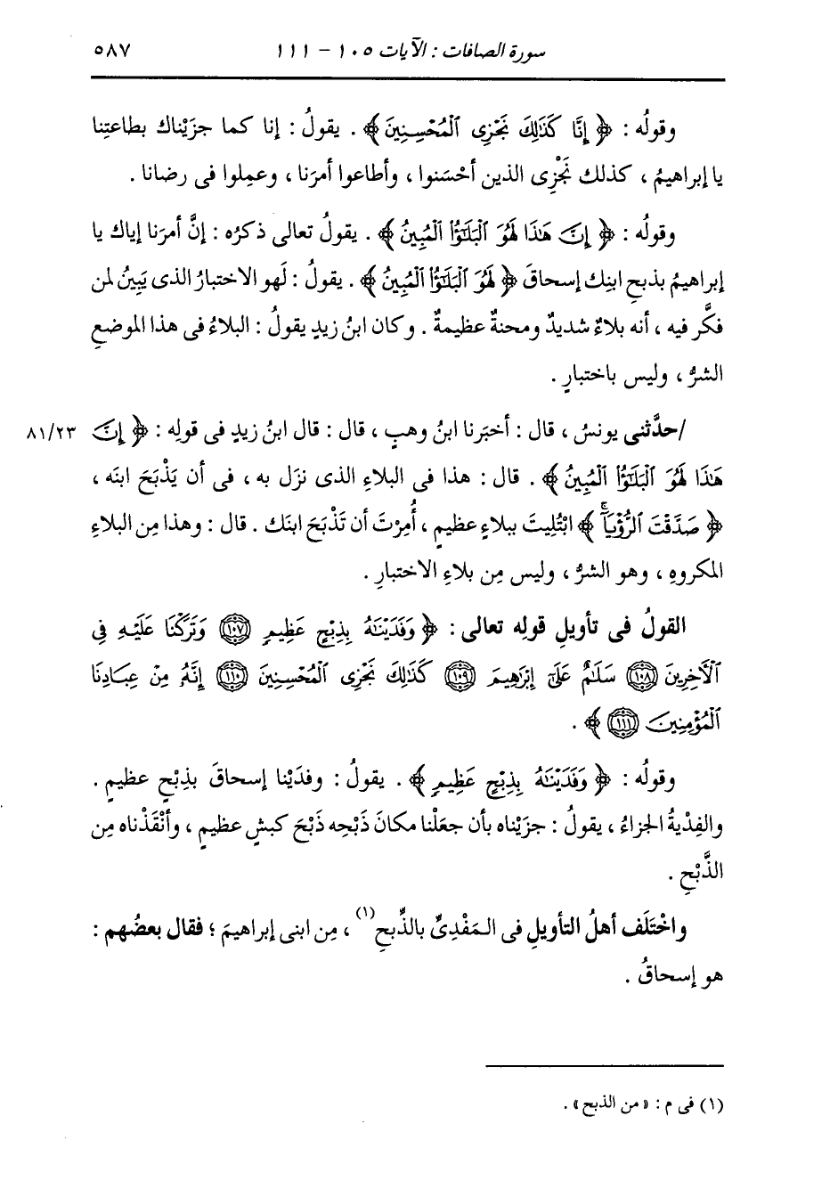 §وَقَوْلُهُ: {وَفَدَيْنَاهُ بِذِبْحٍ عَظِيمٍ} [الصافات: 107] يَقُولُ: وَفَدَيْنَا إِسْحَاقَ بِذِبْحٍ عَظِيمٍ، وَالْفِدْيَةُ: الْجَزَاءُ، يَقُولُ: جَزَيْنَاهُ بِأَنْ جَعَلْنَا مَكَانَ ذَبْحِهِ ذَبْحَ كَبْشٍ عَظِيمٍ، وَأَنْقَذْنَاهُ مِنَ الذَّبْحِ وَاخْتَلَفَ أَهْلُ التَّأْوِيلِ، فِي الْمُفْدِي مِنَ الذَّبْحِ مِنَ ابْنَيْ إِبْرَاهِيمَ، فَقَالَ بَعْضُهُمْ: هُوَ إِسْحَاقُ
