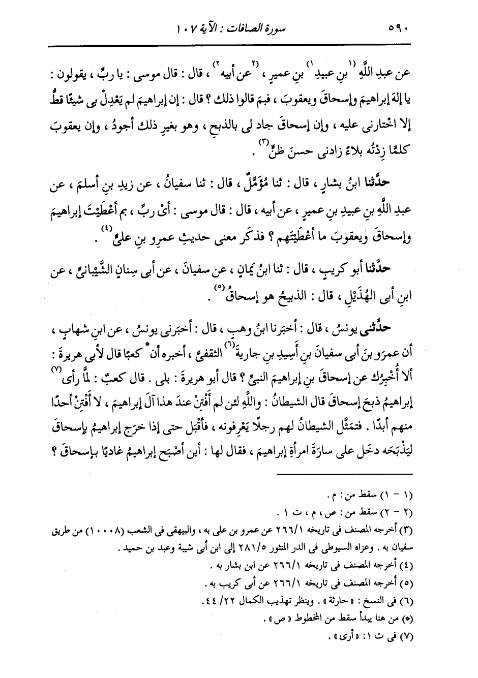 حَدَّثَنَا أَبُو كُرَيْبٍ، قَالَ: ثنا ابْنُ يَمَانٍ، عَنْ سُفْيَانَ، عَنْ أَبِي سِنَانٍ الشَّيْبَانِيِّ، عَنِ ابْنِ أَبِي الْهُذَيْلِ، قَالَ: «§الذَّبِيحُ هُوَ إِسْحَاقُ»