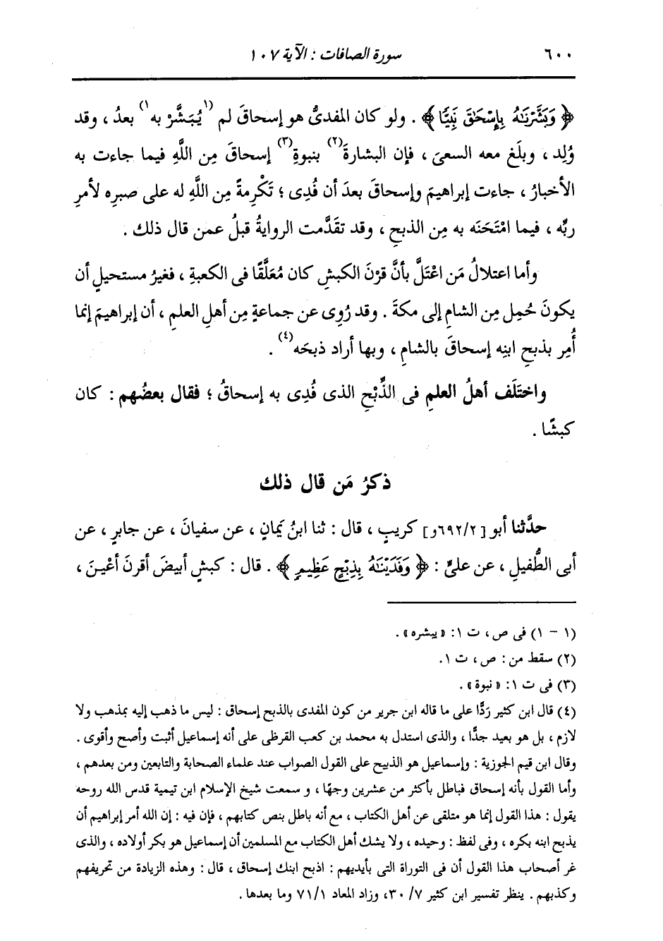 ذِكْرُ مَنْ قَالَ ذَلِكَ: حَدَّثَنَا أَبُو كُرَيْبٍ، قَالَ: ثنا ابْنُ يَمَانٍ، عَنْ سُفْيَانَ، عَنْ جَابِرٍ، عَنْ أَبِي الطُّفَيْلِ، عَنْ عَلِيٍّ {§وَفَدَيْنَاهُ بِذِبْحٍ عَظِيمٍ} [الصافات: 107] قَالَ: «كَبْشٌ أَبْيَضُ أَقْرَنُ أَعْيَنُ -[601]- مَرْبُوطٌ بِسَمُرَةٍ فِي ثَبِيرٍ»