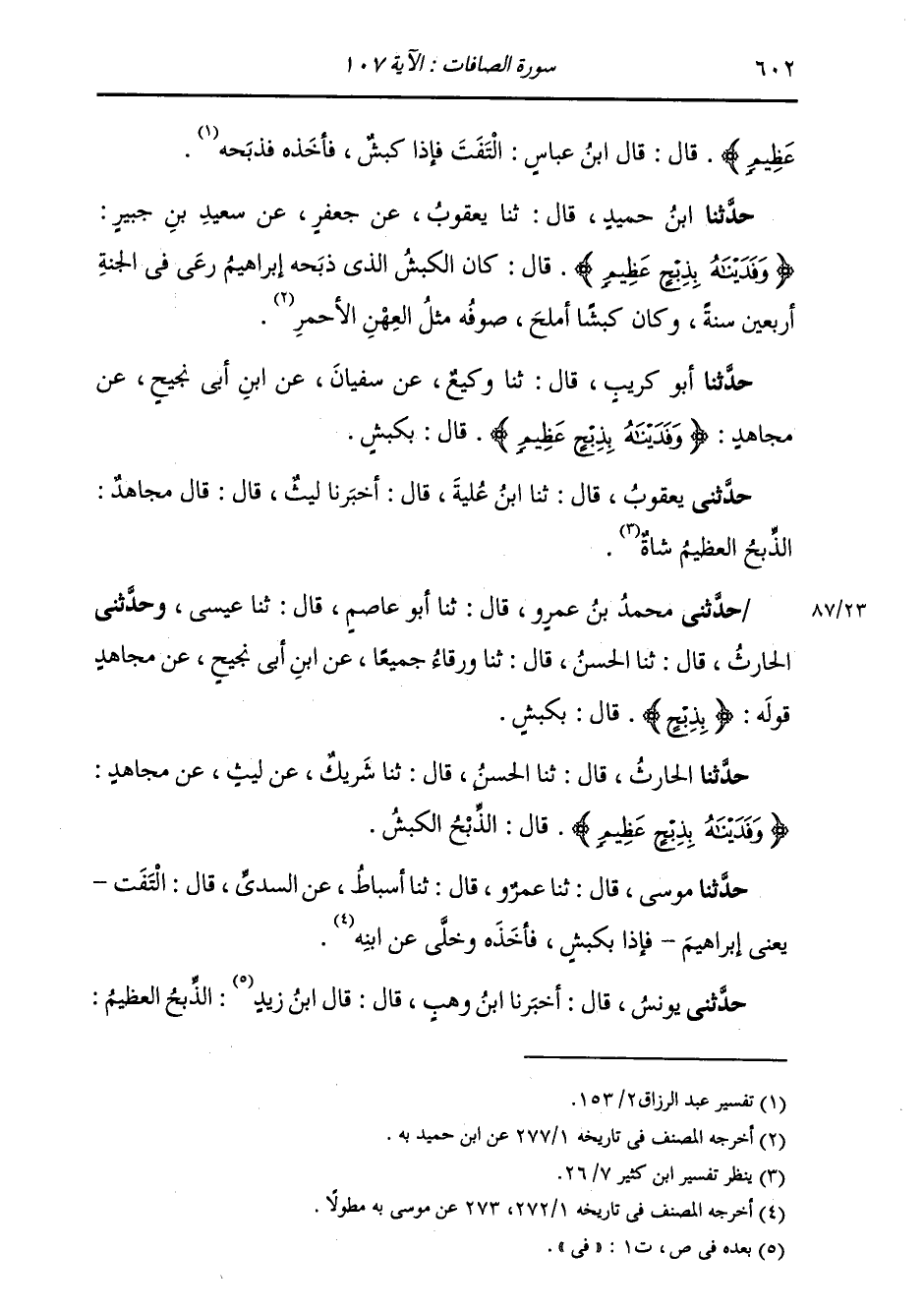 حَدَّثَنَا ابْنُ حُمَيْدٍ، قَالَ: ثنا يَعْقُوبُ، عَنْ جَعْفَرٍ، عَنْ سَعِيدِ بْنِ جُبَيْرٍ {§وَفَدَيْنَاهُ بِذِبْحٍ عَظِيمٍ} [الصافات: 107] قَالَ: «كَانَ الْكَبْشُ الَّذِي ذَبَحَهُ إِبْرَاهِيمُ رَعَى فِي الْجَنَّةِ أَرْبَعِينَ سَنَةً، وَكَانَ كَبْشًا أَمْلَحَ، صُوفُهُ مِثْلُ الْعِهْنِ الْأَحْمَرِ»
