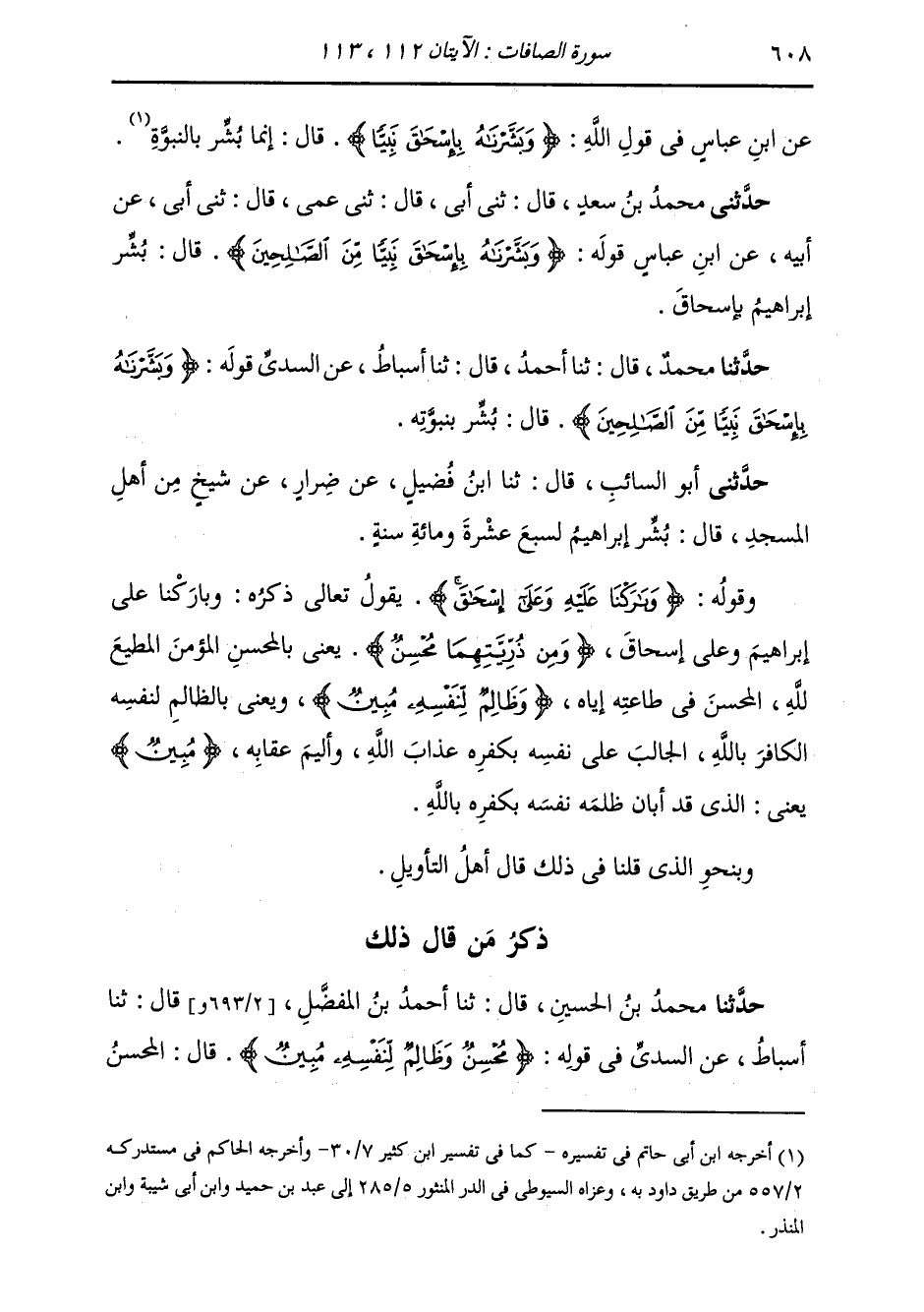 حَدَّثَنِي مُحَمَّدُ بْنُ سَعْدٍ، قَالَ: ثني أَبِي، قَالَ: ثني عَمِّي، قَالَ: ثني أَبِي، عَنْ أَبِيهِ، عَنِ ابْنِ عَبَّاسٍ، قَوْلُهُ: {§وَبَشَّرْنَاهُ بِإِسْحَاقَ نَبِيًّا مِنَ الصَّالِحِينَ} قَالَ: «بَشَّرَ إِبْرَاهِيمَ بِإِسْحَاقَ»
