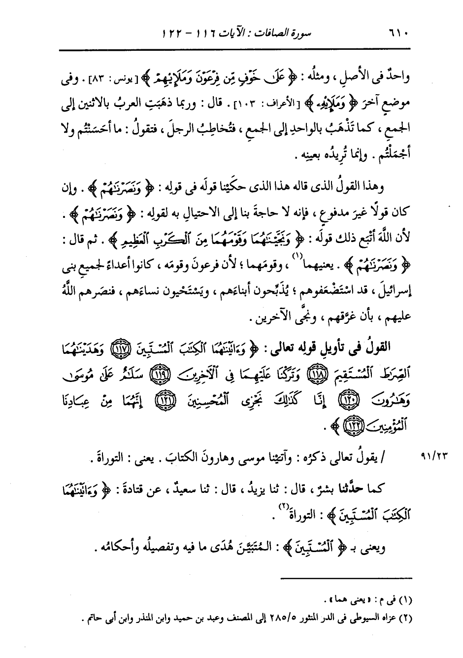 وَاحِدٌ فِي الْأَصْلِ، وَمِثْلُهُ: {عَلَى خَوْفٍ مِنْ فِرْعَوْنَ وَمَلَئِهِمْ} [يونس: 83] ، وَفِي مَوْضِعٍ آخَرَ: {وَمَلَئِهِ} [الأعراف: 103] قَالَ: وَرُبَّمَا ذَهَبَتِ الْعَرَبُ بِالِاثْنَيْنِ إِلَى الْجَمْعِ كَمَا تَذْهَبُ بِالْوَاحِدِ إِلَى الْجَمْعِ، فَتُخَاطِبُ الرَّجُلَ، فَتَقُولُ: مَا أَحْسَنْتُمْ وَلَا أَجْمَلْتُمْ، وَإِنَّمَا تُرِيدُهُ بِعَيْنِهِ، وَهَذَا الْقَوْلُ الَّذِي قَالَهُ هَذَا الَّذِي حَكَيْنَا قَوْلَهُ فِي قَوْلِهِ: {وَنَصَرْنَاهُمْ} [الصافات: 116] وَإِنْ كَانَ قَوْلًا غَيْرَ مَدْفُوعٍ، فَإِنَّهُ لَا حَاجَةَ بِنَا إِلَى الِاحْتِيَالِ بِهِ لِقَوْلِهِ: {وَنَصرْنَاهُمْ} [الصافات: 116] لِأَنَّ اللَّهَ أَتْبَعَ ذَلِكَ قَوْلِهِ: {وَنَجَّيْنَاهُمَا وَقَوْمَهُمَا مِنَ الْكَرْبِ الْعَظِيمِ} [الصافات: 115] ثُمَّ قَالَ: {وَنَصَرْنَاهُمْ} [الصافات: 116] يَعْنِي: هُمَا وَقَوْمَهُمَا، لِأَنَّ فِرْعَوْنَ وَقَوْمَهُ كَانُوا أَعْدَاءً لِجَمِيعِ بَنِي إِسْرَائِيلَ، قَدِ اسْتَضْعَفُوهُمْ، يَذْبَحُونَ أَبْنَاءَهُمْ، وَيَسْتَحْيُونَ نِسَاءَهُمْ، فَنَصَرَهُمُ اللَّهُ عَلَيْهِمْ، بِأَنْ غَرَّقَهُمْ وَنَجَّى الْآخَرِينَ